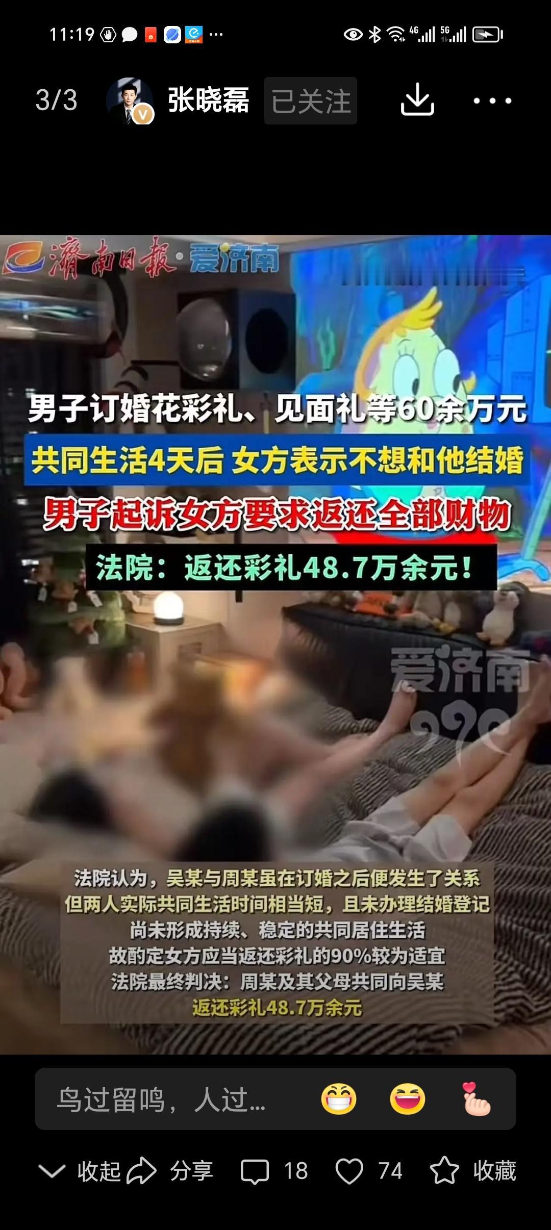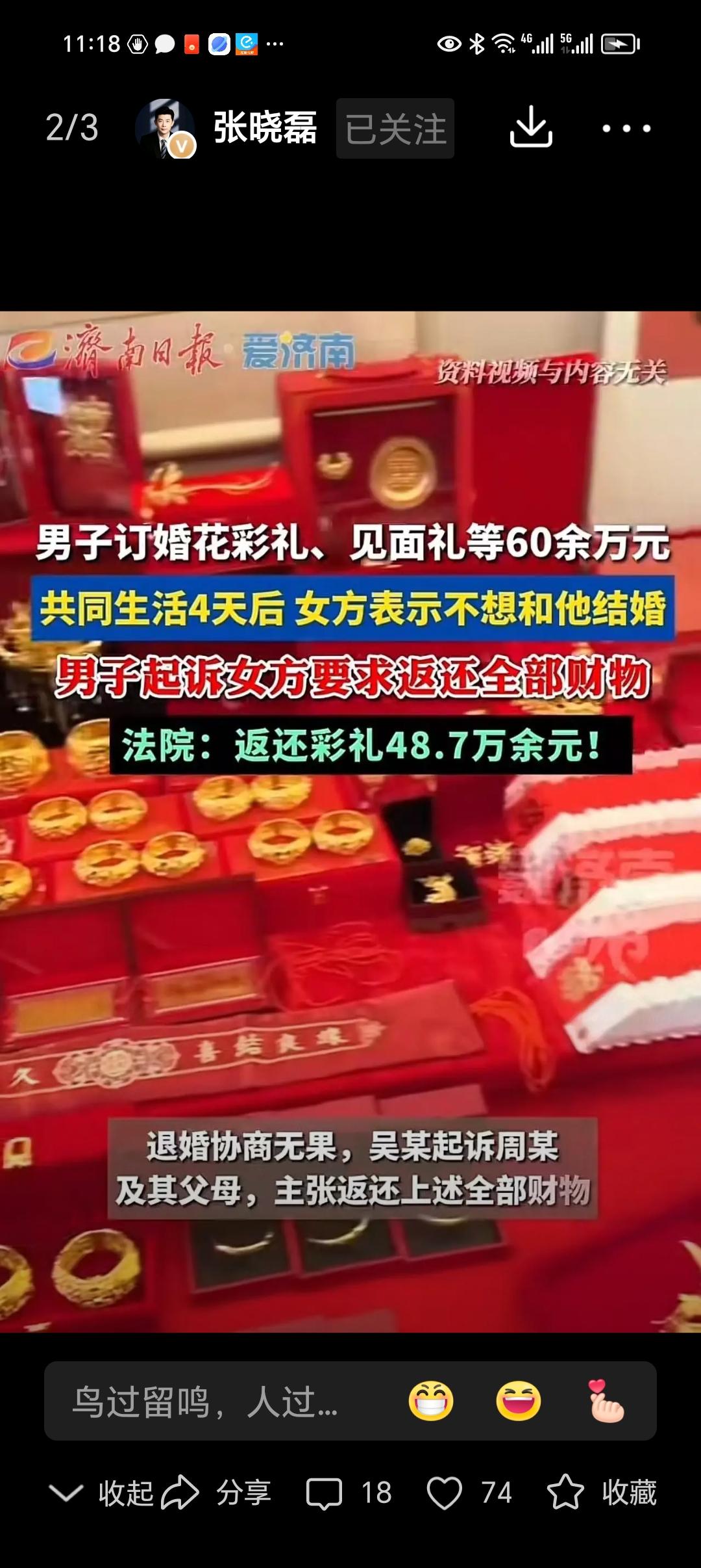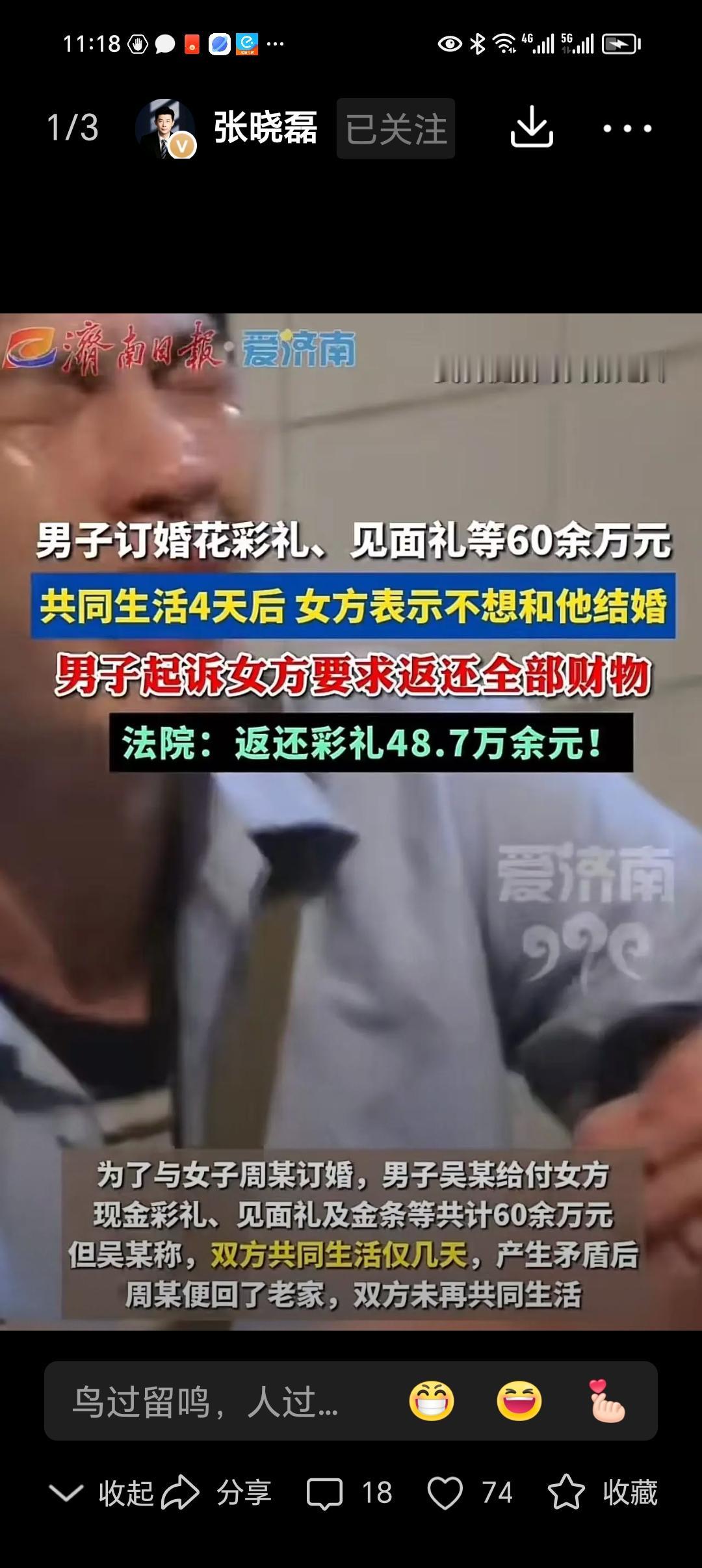 就在那短短的四天里,这场“爱情”变成了一场“生意”。男子满心期待着未来的幸福,筹划着订婚、彩礼、见面礼,总共花了60多万元。本以为这是一段值得用心经营的爱情,没想到,才刚刚开始共同生活的第四天,女方竟然轻描淡写地说:“我不想结了。”一夜之间,所有的梦想似乎都变成了泡影。 但令人震惊的是,男子没有选择放手,他选择了用法律来维护自己的权益。法院最终判决,女方应返还彩礼48.7万余元。这个判决引发了网友们的热烈讨论:“四天赚12万,这是大生意啊,真赚钱,还没什么本钱!”有人调侃:“这真是‘爱情’的‘生意经’,看似投入巨大,实际上利润可观。”也有人感叹:“这不是爱情,是一场资本游戏,真是让人心寒。” 故事的背后,折射出当下社会中一种令人担忧的现象:有人将婚姻变成了“投资”,把感情变成了“买卖”。而那些投入巨额彩礼的年轻人,是否也在无形中陷入了一场“看似浪漫,实则风险重重”的“商战”?他们的付出,是否真的值得?更何况,四天的“合作期”就结束了,爱情的真谛在哪里?难道仅仅是金钱的交易? 这件事也让人深思:爱情和婚姻,究竟是情感的结合,还是一场资本的博弈?在这个物欲横流的时代,感情似乎变得越发脆弱,变成了“买卖”中最脆弱的一环。有人说:“这只是个极端案例,但也反映了社会某些潜在的问题。”有人则呼吁:“婚姻应当是心与心的交流,而不是金钱的交易。”而对于那些还在迷茫中的年轻人,或许更应该学会理性面对感情,不要让“金钱”成为爱情的唯一衡量标准。 这个故事告诉我们:爱情不是买卖,婚姻不是投资。真心付出,应该是出于对彼此的珍惜和理解,而不是一场“高利润”的交易。否则,最终输的,可能不仅仅是金钱,更是那份纯粹的感情和人生的信任。希望每一位年轻人都能明白,爱情的价值远远超出金钱的数字,而真正的幸福,是心灵的相知相守。婚恋彩礼