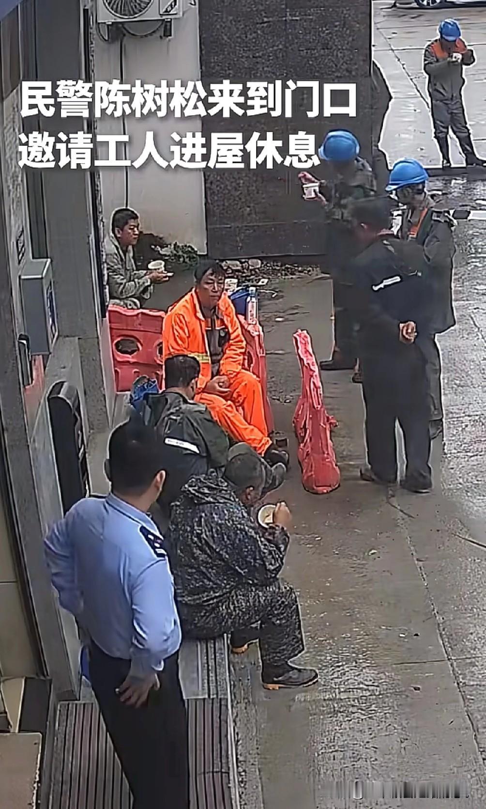 警民一家在这一刻具象化了,近日在湖北黄石,几位工人在吃中饭,没有凳子和桌子就随便找个台阶坐下就吃。 由于刚下过雨,地面还比较潮湿,工人师傅只能蹲着,他们吃饭的地方就是在派出所门口,这时从里面出来了一位帽子叔叔。 可能工人师傅也知道,他们躲在派出所门口不会被赶走,只是他们没有想到会被邀请到里面坐着吃饭。 帽子叔叔邀请几位工人师傅进去吃,里面不冷还有凳子,可以坐着安心的吃饭,几位工人师傅不好意思,连面摆手拒绝,在帽子叔叔再三邀请下,几位工人师傅在办事大厅里吃饭。 由于天气转冷,工人师傅也没有带热水,帽子叔叔看工人师傅吃完饭也没有热水喝,就又烧了些热水给他们喝,还特意拿了一次性杯子,给每人都倒了一杯。 为了能够让工人师傅不尴尬,帽子叔叔一直在和他们聊天,试图化解他们心理的不适,帽子叔叔说,天气那么冷,看到你们坐在门口我心里不舒服。 这就是人民警察,能够理解人民,人民有问题能够及时解决!