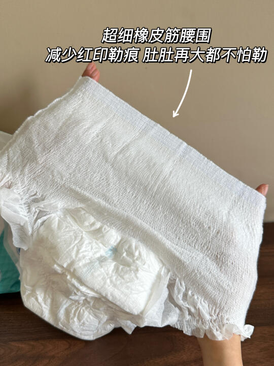 在舒适度上,它下足了功夫。精心设计的腰围,搭配超细橡筋,密度大幅增加。相比普通纸尿裤,能将皮肤压迫感降低 80%,就像被温柔的云朵☁️轻轻包裹,让肌肤自在呼吸。