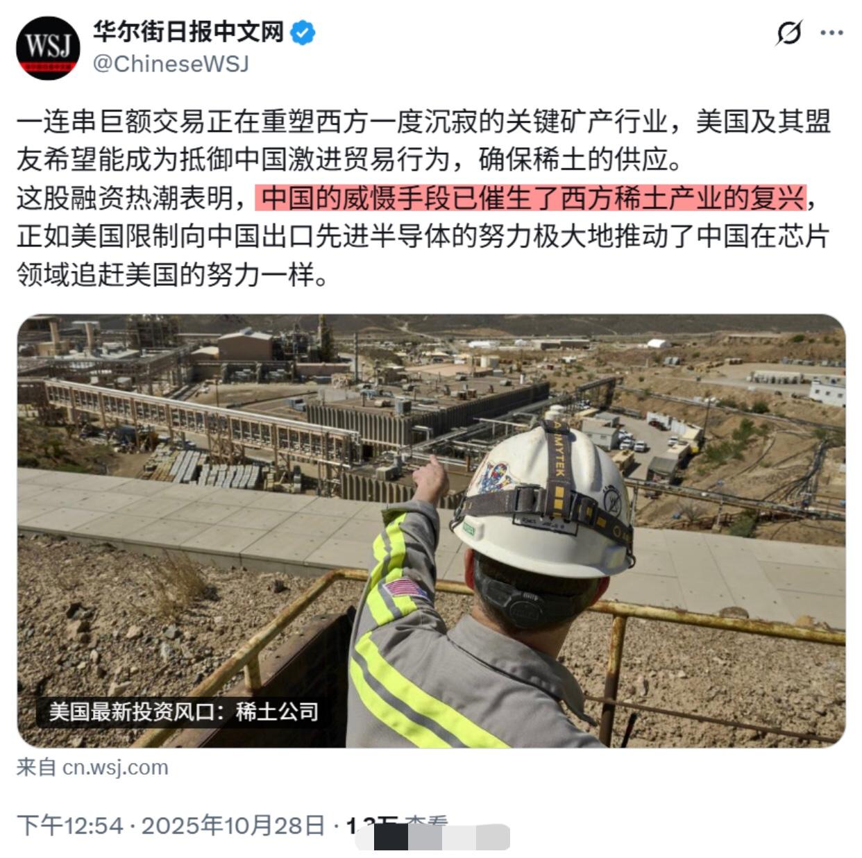 美国最新投资风口:稀土公司。 美国华尔街日报发文表示:“美国及盟友正在通过一连串巨额交易重塑西方一度沉寂的关键矿产行业,他们希望此举能成功抵御中国激进贸易行为,确保稀土的供应。 这股融资热潮表明,中国的威慑手段已催生了西方稀土产业的复兴,正如美国限制向中国出售先进半导体的努力极大的推动了中国在芯片领域追赶美国的努力一样。”