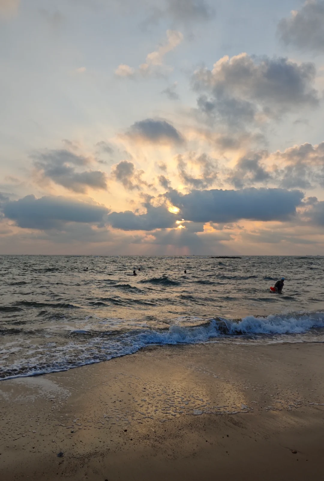 然后沿海往北走。途径:百合湾、荣成华星宾馆、爱莲湾、摩天岭索道、云帆水驿游艇俱乐部、布鲁威斯号邮轮、那香海、逍遥湾、悦海公园、威海公园、幸福门。时间有点晚,直接去威海国际海水浴场看日落。
