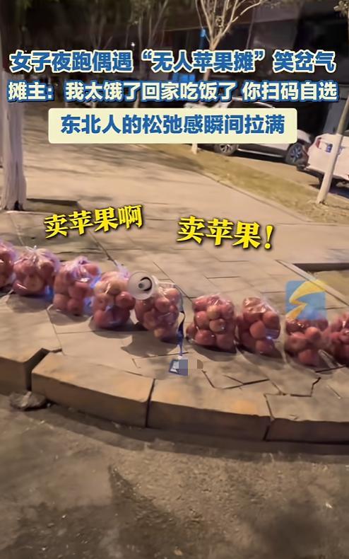 “笑不活了!”10月27日,辽宁鞍山,一女子夜跑时遇到了个无人苹果摊,几袋苹果整整齐齐摆在地上,摊主用一个大喇叭在喊着自己回家吃饭了,要买苹果自助购买,这可把女子笑岔了气!网友:这就是东北人的松弛感吗! 在人们的印象中东北人热情奔放、不拘小节,有时他们的松弛感往往超乎你的想象。 一女子夜跑时偶遇了一个奇怪的苹果摊,只见几袋又大又红的苹果整整齐齐打包好,放在路边一字排开,可小摊无人看管,摊主不知所踪,只留下了一个收款二维码。 正当女子疑惑时,苹果上面的大喇叭传出摊主的声音,摊主称自己太饿了,必须回家吃饭,如果要购买苹果,请自行扫码购买,他还幽默地表示,20块钱买不了吃亏,买不了上当。 这些话配上摊主的东北口音,有种说不出来的喜感,女子在路边笑岔了气,正常来说,摊主如果回家吃饭都会把货物先收走,这个苹果摊摊主的心未免也有些太大了,不过这种信任感让人心暖暖的。 不少网友感慨这就是东北人的松弛感吗,不得不说,小摊虽然无人看管,但听摊主这意思估计也没有人会趁机偷拿,摊主虽然不在现场叫卖,但大喇叭里幽默的宣传也能吸引路人驻足! 信息来源:《女子夜跑偶遇“无人苹果摊”笑岔气,摊主:我太饿了回家吃饭了,你扫码自选!》闪电新闻