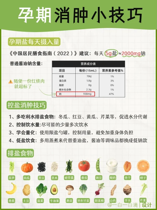 📒所以我整理了孕期消肿小技巧和明星减盐消肿食物(详见图2),可以换着花样吃