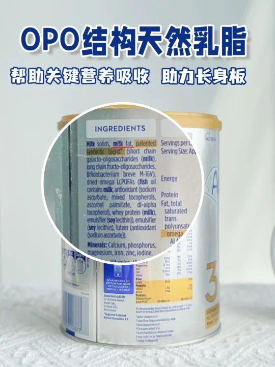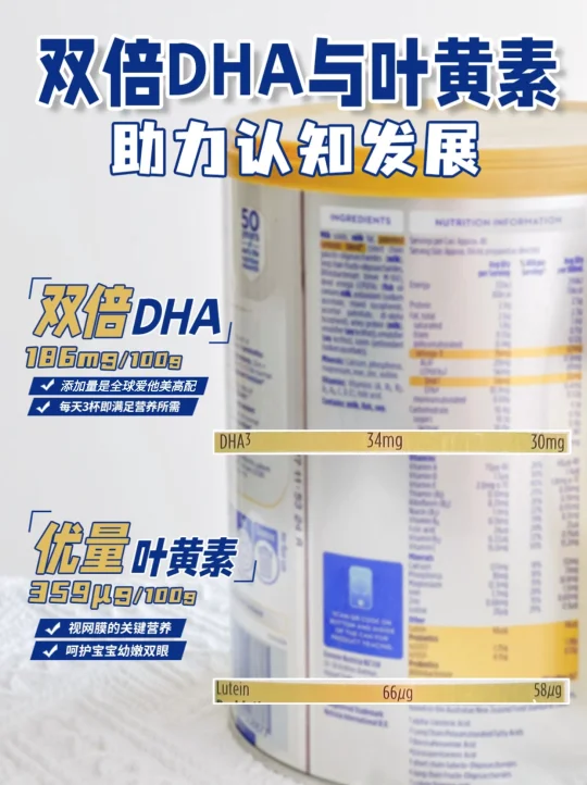 再配上超百种结构益生元GOS/FOS(13.1g/L),让益生菌吃饱喝足,菌元搭配,干活不累,实证12周就把肚肚环境维护的稳稳当当!宝宝体质好少不适,吸收还好,每天都是黄金便便,自然越长越好,搭配上营养吸收“小管家”OPO结构天然乳脂,给肚肚“减负”,钙和脂肪吸收效率也是蹭蹭涨,小身板曲线也是一直向上,还有双倍DHA,直接卷到186mg/100g,添加量是全球爱他美z高,搭配优量叶黄素359μg/100g,相当于给宝宝眼睛戴了“天然墨镜”。