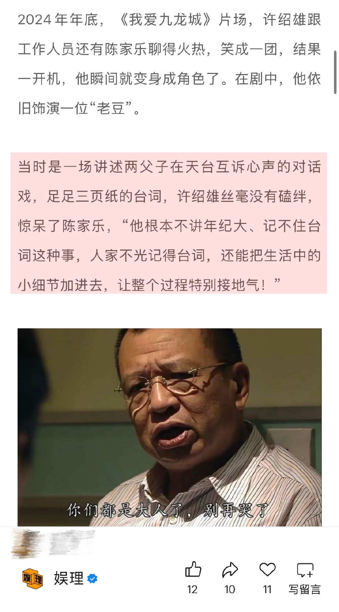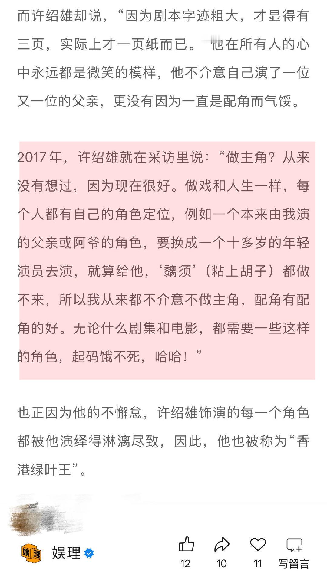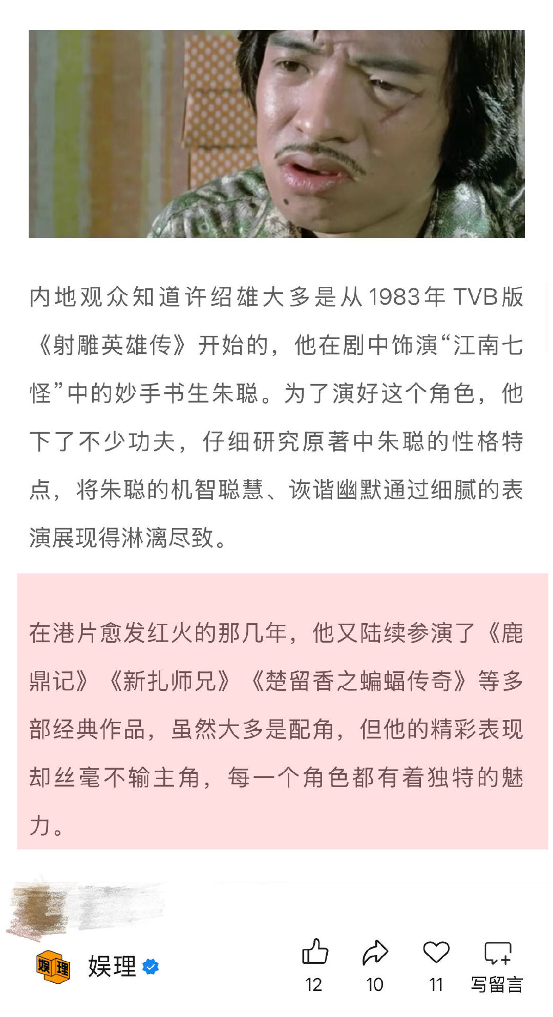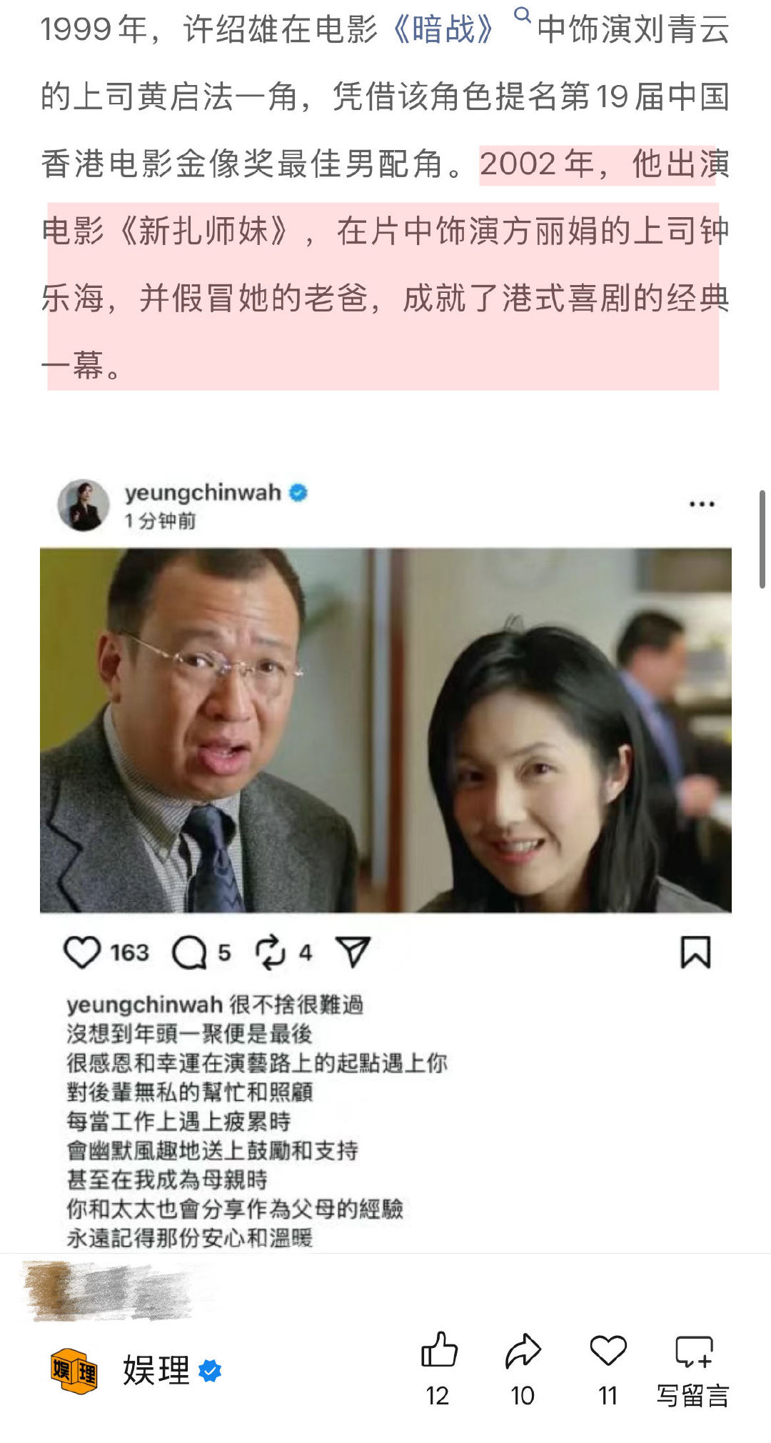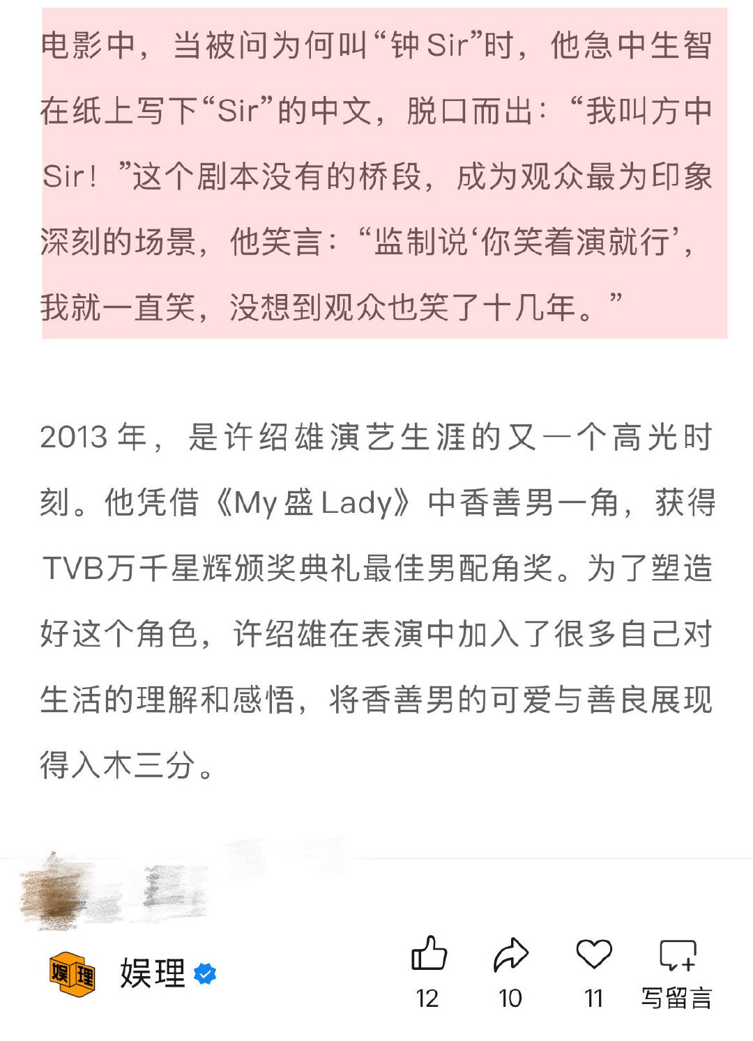 许绍雄 演到生命的最后一刻 许绍雄说最好的告别是活在角色里 许绍雄曾在电影《新扎师妹》中饰演方丽娟的上司钟乐海,并假冒其老爸,成就港式喜剧经典一幕。电影中他脱口而出的“我叫方中Sir!”,是剧本中没有的桥段,观众最为印象深刻的场景,许绍雄笑言:“监制说‘你笑着演就行’,我就一直笑,没想到观众也笑了十几年。”娱理独家↓