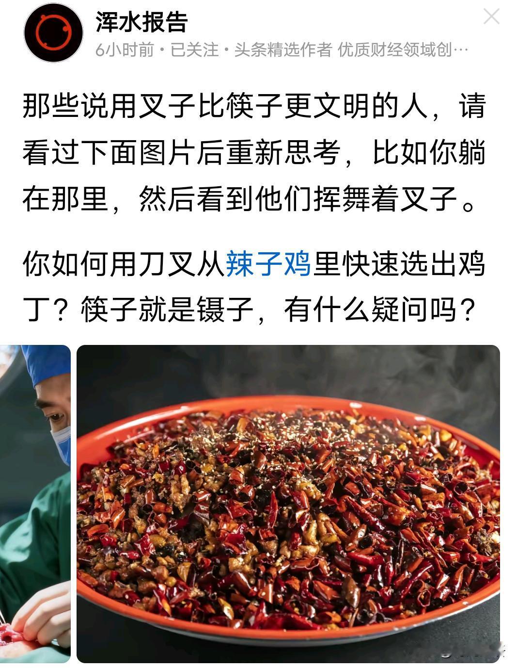 刀叉是强盗逻辑,筷子是东方智慧的结晶,抛开文明不说至少用筷子比用刀叉的人更聪明。 筷子能夹能挑能拨,应对各种菜品都会从从容容游刃有余。 说刀叉更文明的,怕是没体验过用筷子吃花生米的快乐。 比如一只猴子可以学会使用刀叉,但要让它学会使用筷子比登天都难,因为进化的过程是很漫长的。 浑水先生举的这个例子还是很精彩的,在辣子鸡里挑鸡丁,筷子夹起肉来又准又稳,叉子怕是只能戳着辣椒瞎忙活了。 文明从来不是单靠餐具定义的,只有看着西方什么都好、什么都是文明的大侄子们才会这么认为……