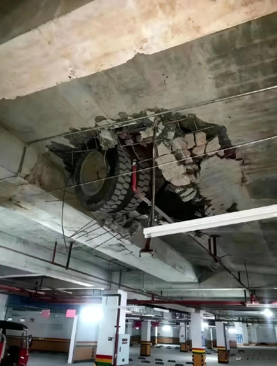地下车库楼板被车压塌了,我想问这是车陪楼,还是楼陪车。我担心的问题终于出了,以前我的四桥罐车经常拉十方混凝土在楼板上去打混凝土,重量约40吨,我就老是担心塌了怎么办。地库楼板居然能被车压塌,这属于特别严重的质量事故了吧。目测这个面很薄,正常双层钢筋20公分厚可以承载55吨罐车,这个目测是十来公分的单层钢筋。司机是个人才,这又不是桥面,是楼面,重型货车也敢开上去。动不动就说超重车,没有这车这栋楼用什盖,怎么不找其它原因,路坏,楼坏,桥坏,都是车压的?