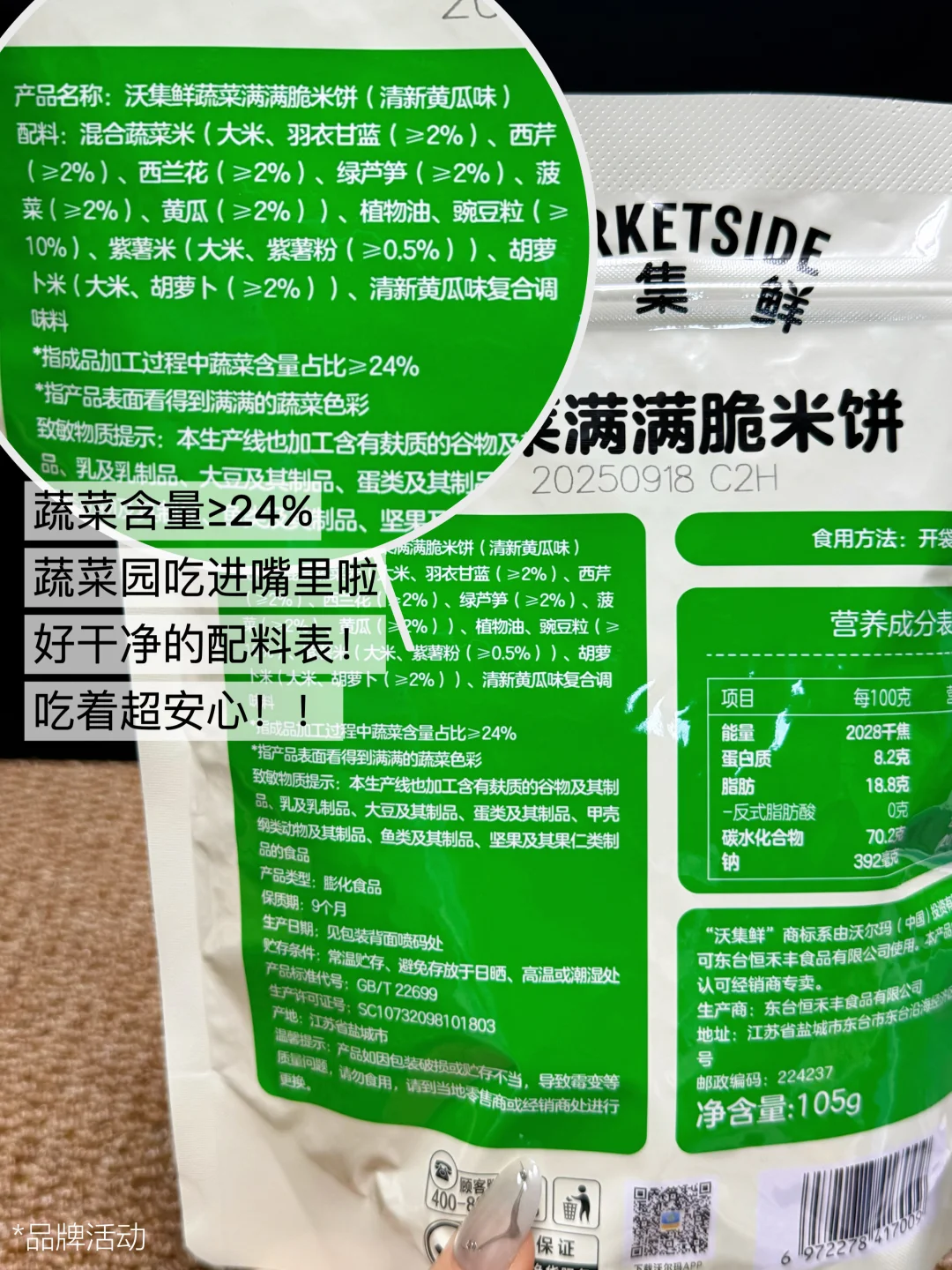 结果一眨眼吃了一包。。 就是这个沃集鲜蔬菜满满脆米饼! 本自律小猪一看到就挪不动脚了... 毕竟沃集鲜的产品干净到跺脚! 原料都是挑地标产地的 配料表能不加的绝对不乱加 一片米饼=九种蔬菜?! 掰开米饼能看到密密麻麻的蔬菜碎! 一口咬下去清清爽爽的黄瓜味~ 膳食纤维蹭蹭补,挑食的我也能偷偷吃菜了 而且非油炸0️⃣反式脂肪酸! 我直接囤了好几包 工作日下午饿的时候咔嚓咔嚓 清爽不腻,吃起来完全没负罪感~ 🛒 购买小贴士: 只有沃尔玛线下/线上才能买到哦! 健康又解馋,姐妹们冲就完事了!✨