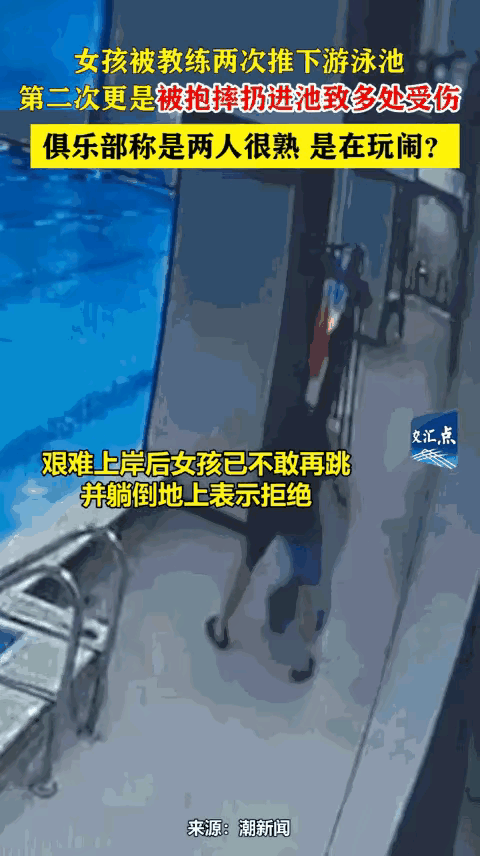 “严查到底!”江苏南京,一女孩去上游泳课,结果却被教练一把推入泳池,女孩挣扎着爬了上来,已经不敢再跳,还躺在地上表示拒绝,教练见状却粗鲁的抱起女孩,再次将其扔进泳池,导致女孩左耳软骨断裂!游泳馆:二人系在玩闹。 网友评论: 其实把人推下水去是一个取游泳的有效克服害怕心理的办法,但要有限度有保护地进行,决不能暴力地进行,尤其不能重复。这个教练属于虐待了,必须清除出教练行列。 应该不是闹着玩,我十年前做教练的时候,有个别学生恐深水,1米游得很好,过1.2以上就是不敢下,有次在池边我也是把他推下深水池了,从此之后再也不惧深水了,不过不提倡这种行为,就怕物极必反。 这样的人怎么能做教练?粗鲁霸道,这不是害这个孩子吗?希望严查并追究这个教练的责任。 这样的游泳教练太粗暴。不是在耐心的教练游泳。而将小女孩学员扔水里。倒至耳朵受伤肿疱送进了医院。这样的教练谁敢再这里学游咏啊。