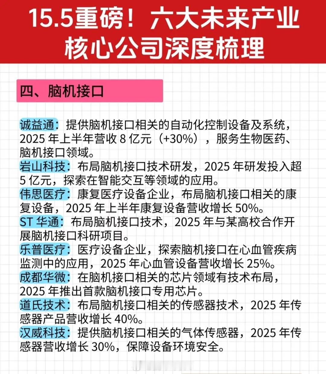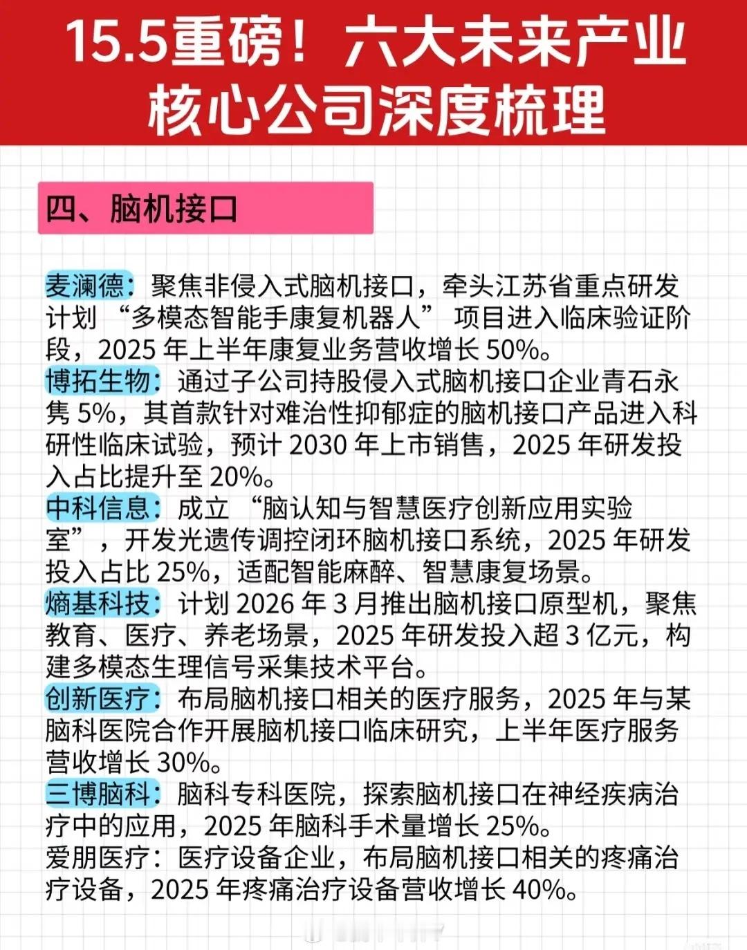 - 创新医疗:布局脑机接口相关医疗服务,2025年与脑科医院合作开展临床研究,上半年医疗服务营收增长30%。
