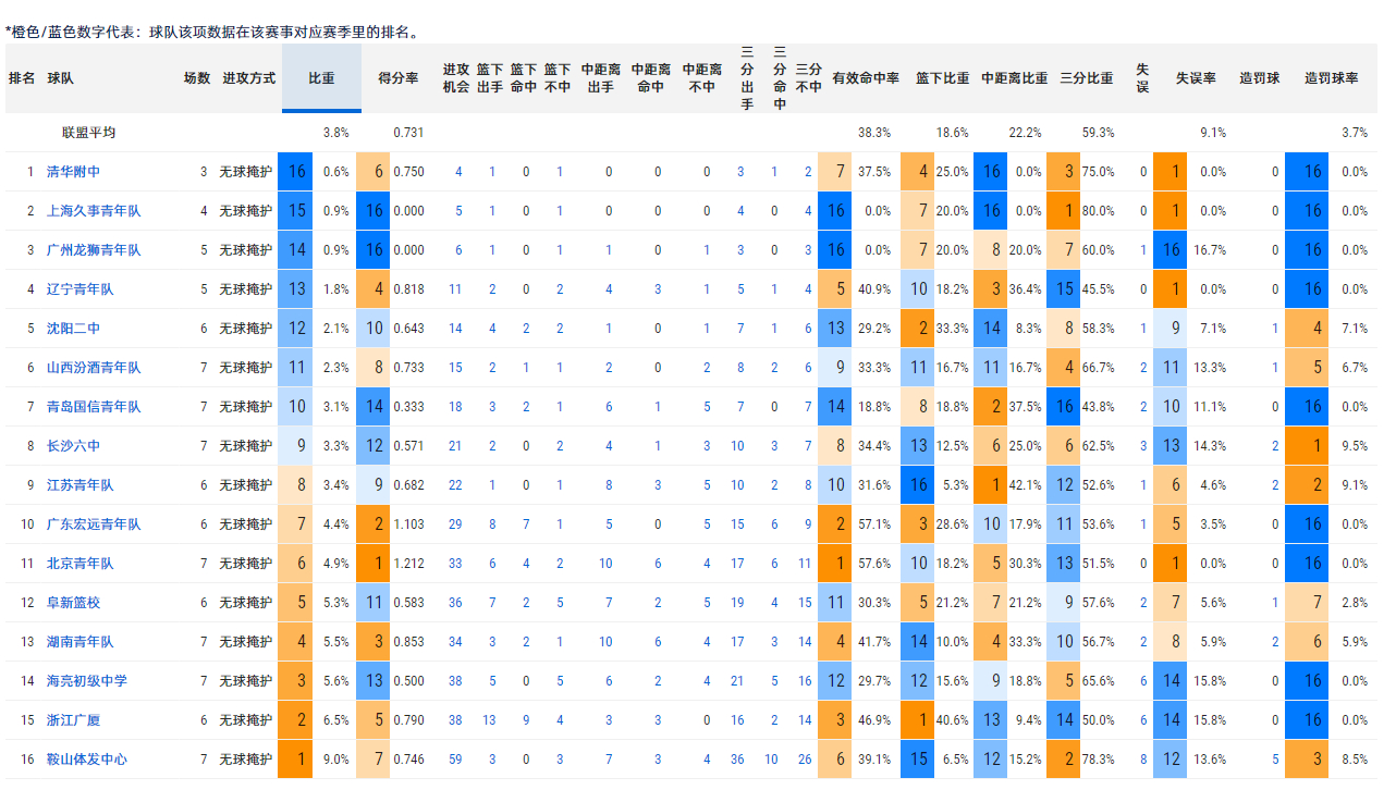 看了一下数据,这次U17青年联赛在数据上的表现也是有点极端了。16支决赛球队,只有辽宁青年队挡拆比重超过了20%,有9支球队挡拆比重在10%以下。而且大部分球队挡拆持球的有效命中率并不高。等于是打得少,水平也低。