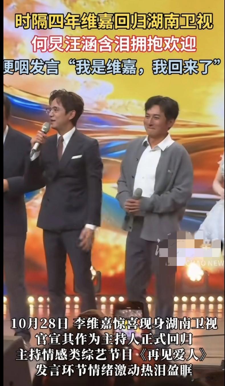 家人们谁懂啊!昨天李维嘉回归湖南卫视的场面也太好哭了吧! 时隔四年,嘉哥终于回来了!10月28日他惊喜现身,官宣主持《再见爱人》。发言的时候哽咽着说“我是维嘉,我回来了”,把何炅汪涵都整泪目了,三人拥抱那一下,多少人的青春DNA动了! 想当年《快乐大本营》的日子,嘉哥的梗和笑声真的是快乐源泉。这几年虽然没在台里看到他,但大家一直惦记着。现在回归主持情感综艺,感觉他肯定能把那些细腻的情绪拿捏得死死的! 咱就是说,湖南卫视的老朋友们这波重聚,真的太让人感动了。期待嘉哥在《再见爱人》里的表现,冲就完事儿!