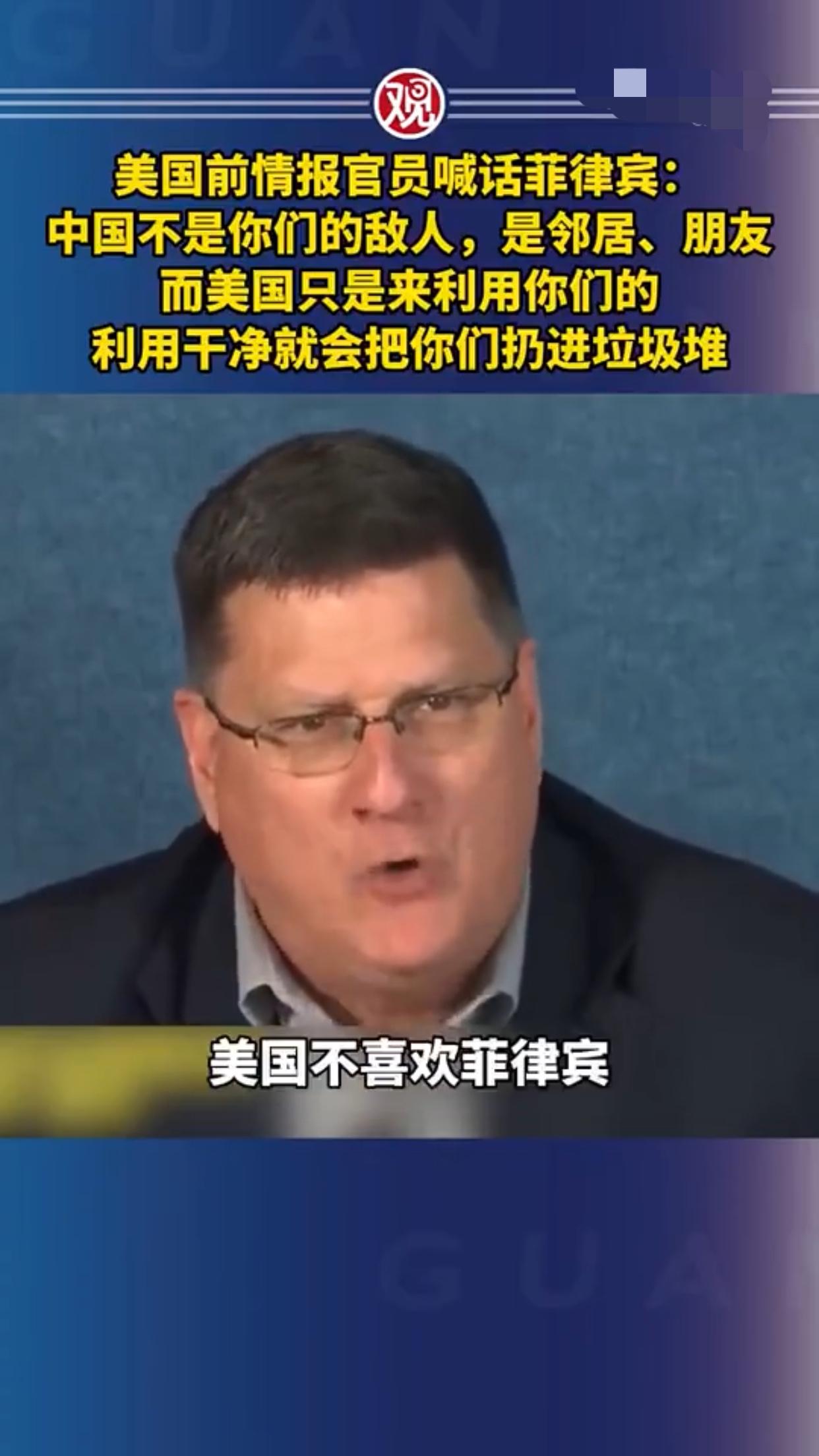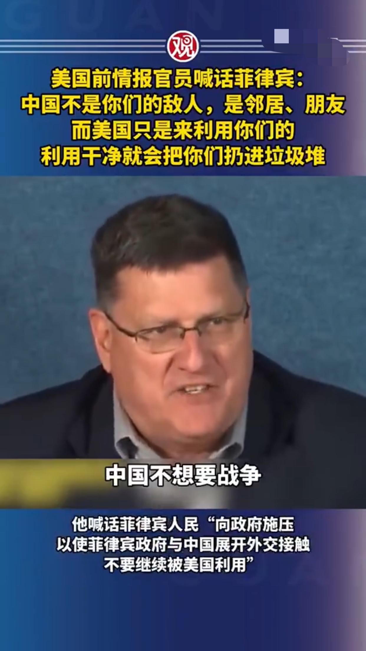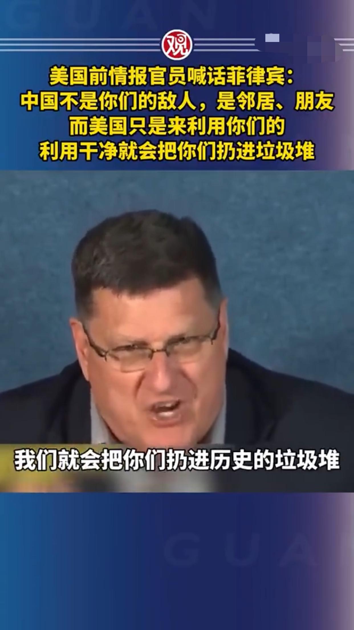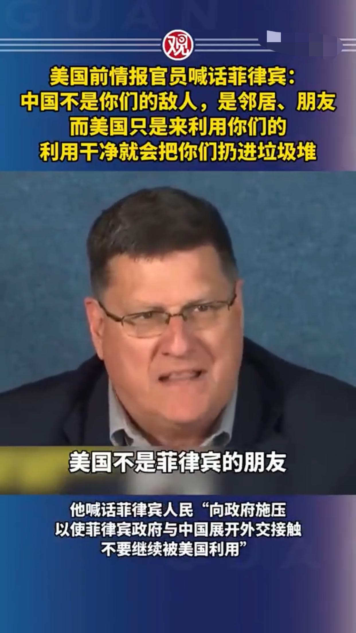 美国前情报官员向菲律宾喊话称:“ 中国不是你们的敌人,中国是你们的邻居,中国是你们的朋友,中国不想要战争,美国不是菲律宾的朋友,美国不喜欢菲律宾,美国只是在利用菲律宾,把菲律宾当工具,美国不是来帮你们的,美国只是来利用你们的,等到你们不再有利用价值,我们就会把你们扔进历史的垃圾堆。”