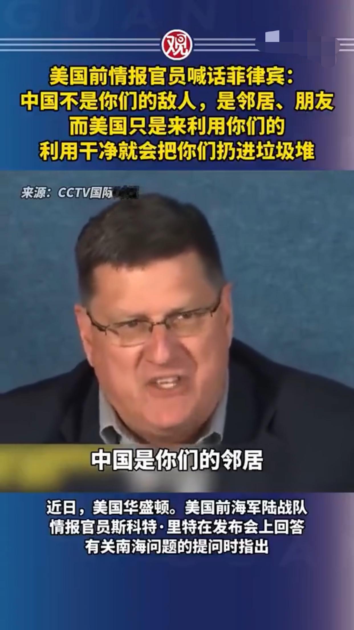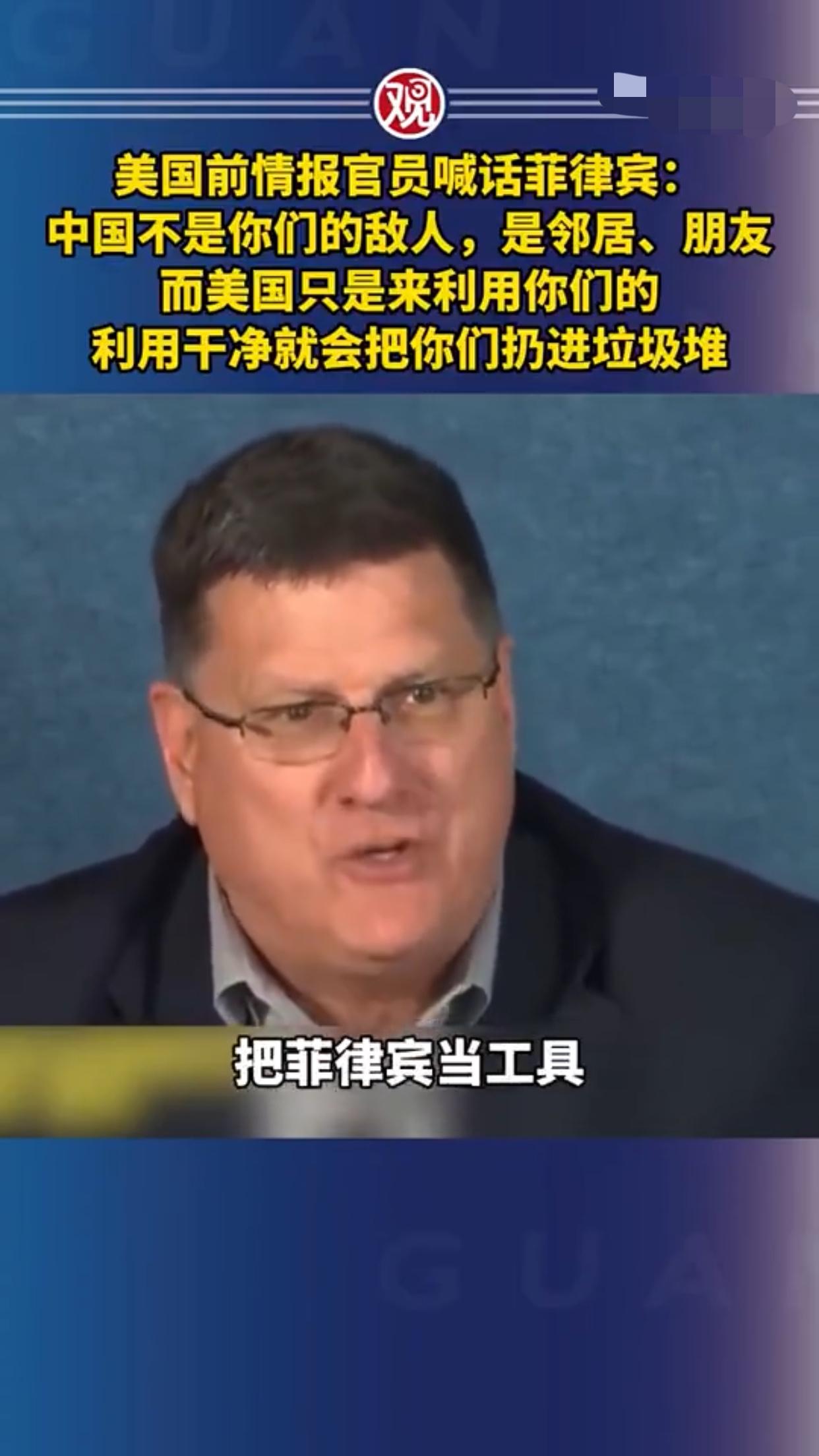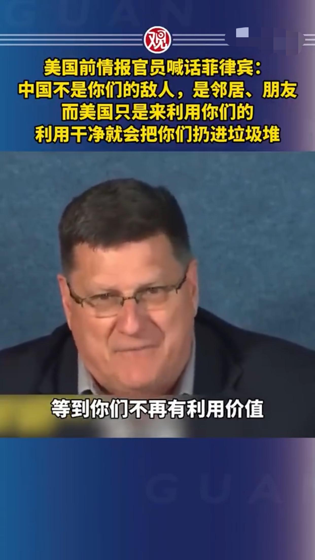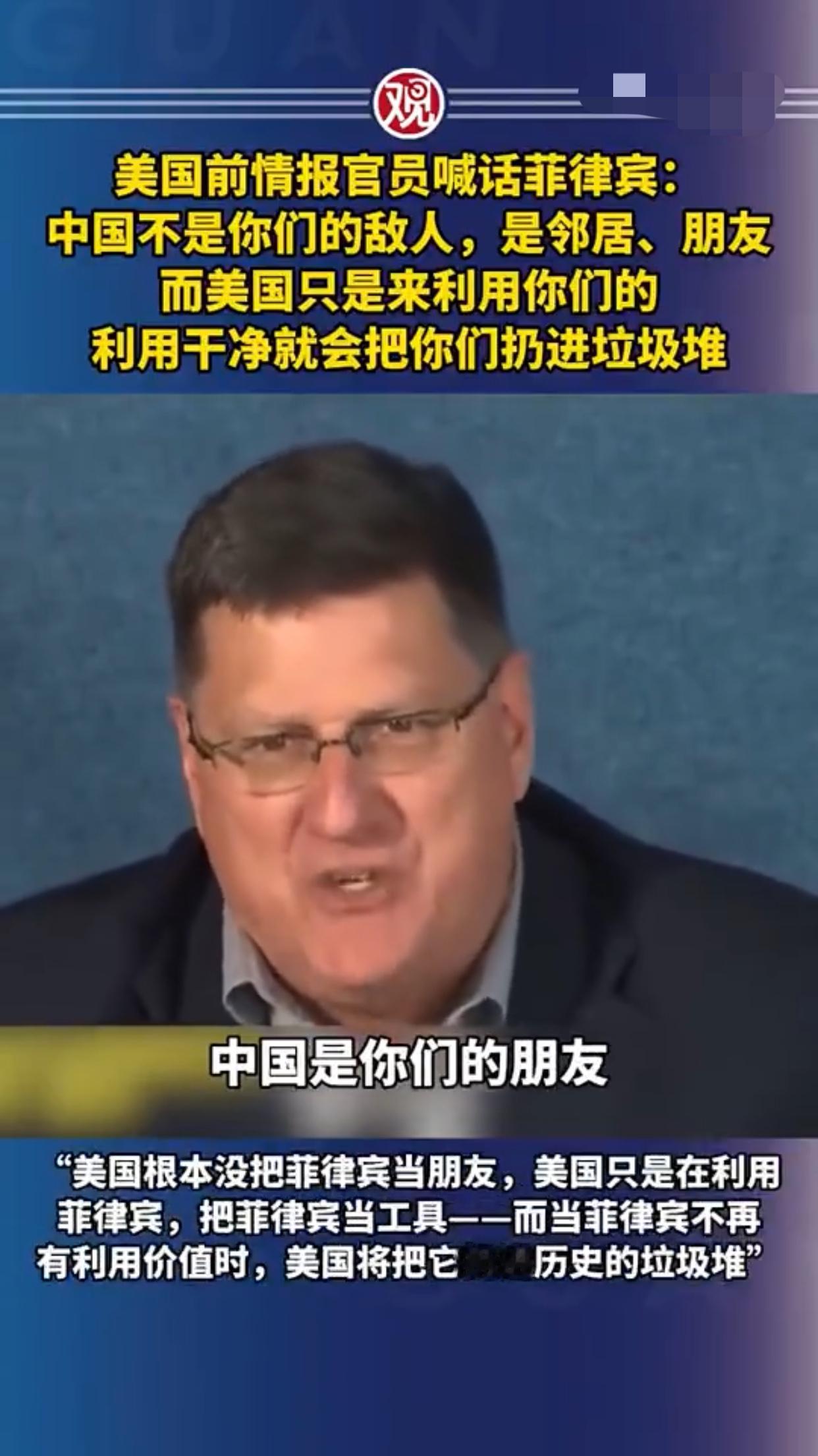 美国前情报官员向菲律宾喊话称:“ 中国不是你们的敌人,中国是你们的邻居,中国是你们的朋友,中国不想要战争,美国不是菲律宾的朋友,美国不喜欢菲律宾,美国只是在利用菲律宾,把菲律宾当工具,美国不是来帮你们的,美国只是来利用你们的,等到你们不再有利用价值,我们就会把你们扔进历史的垃圾堆。”