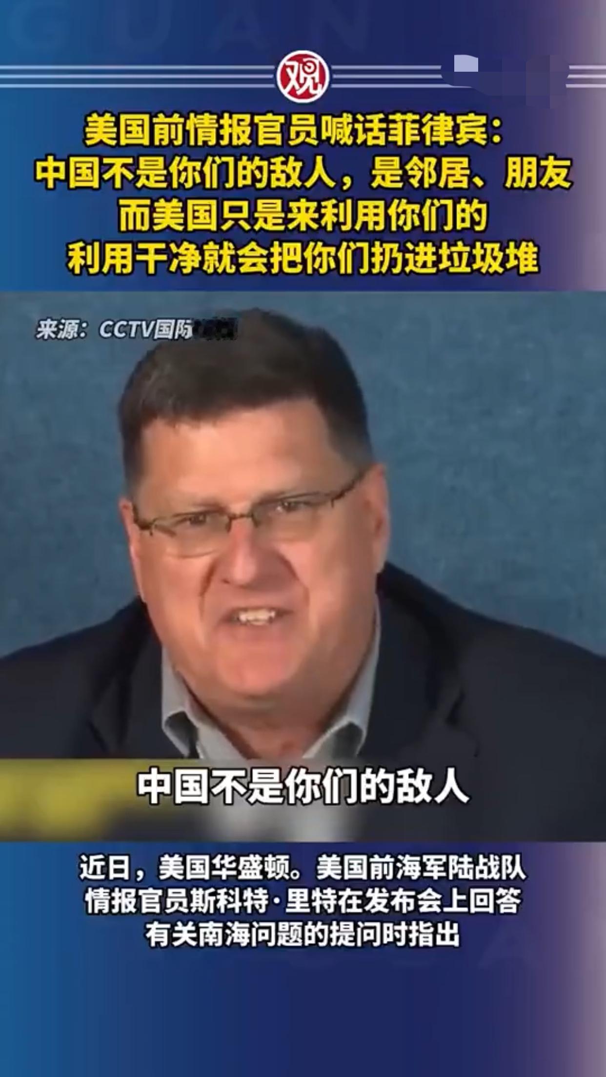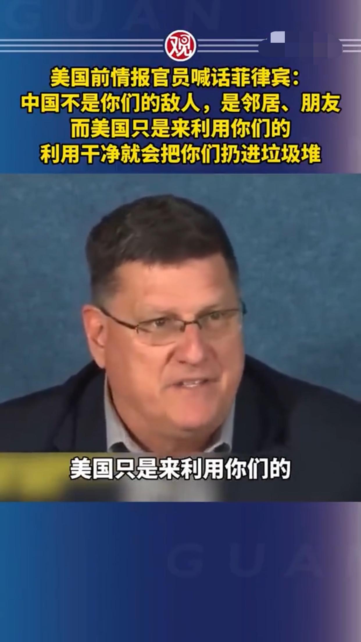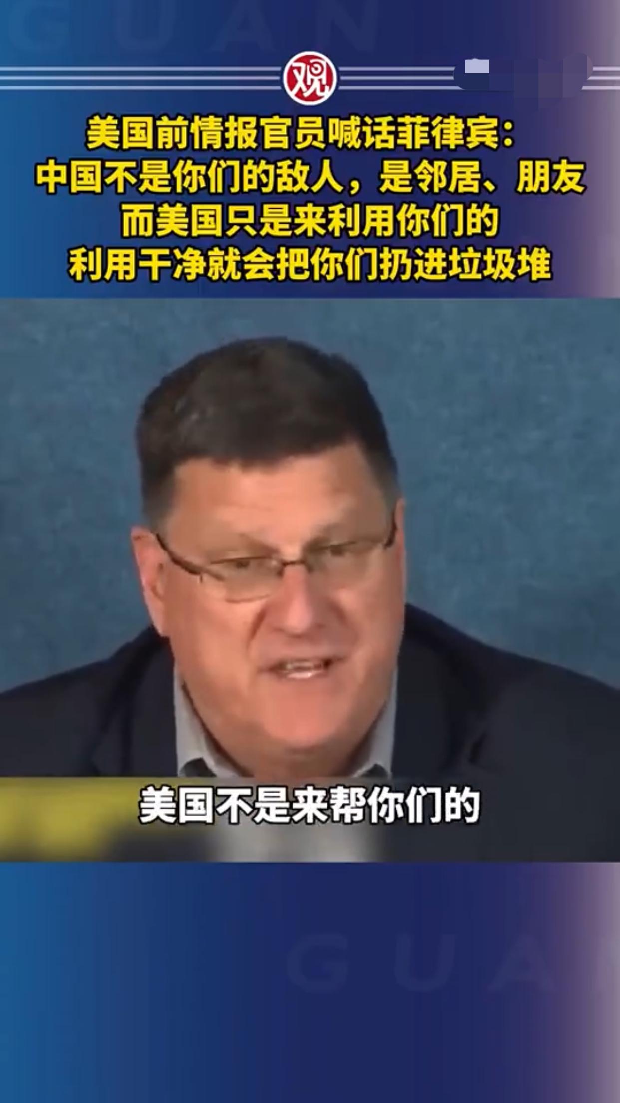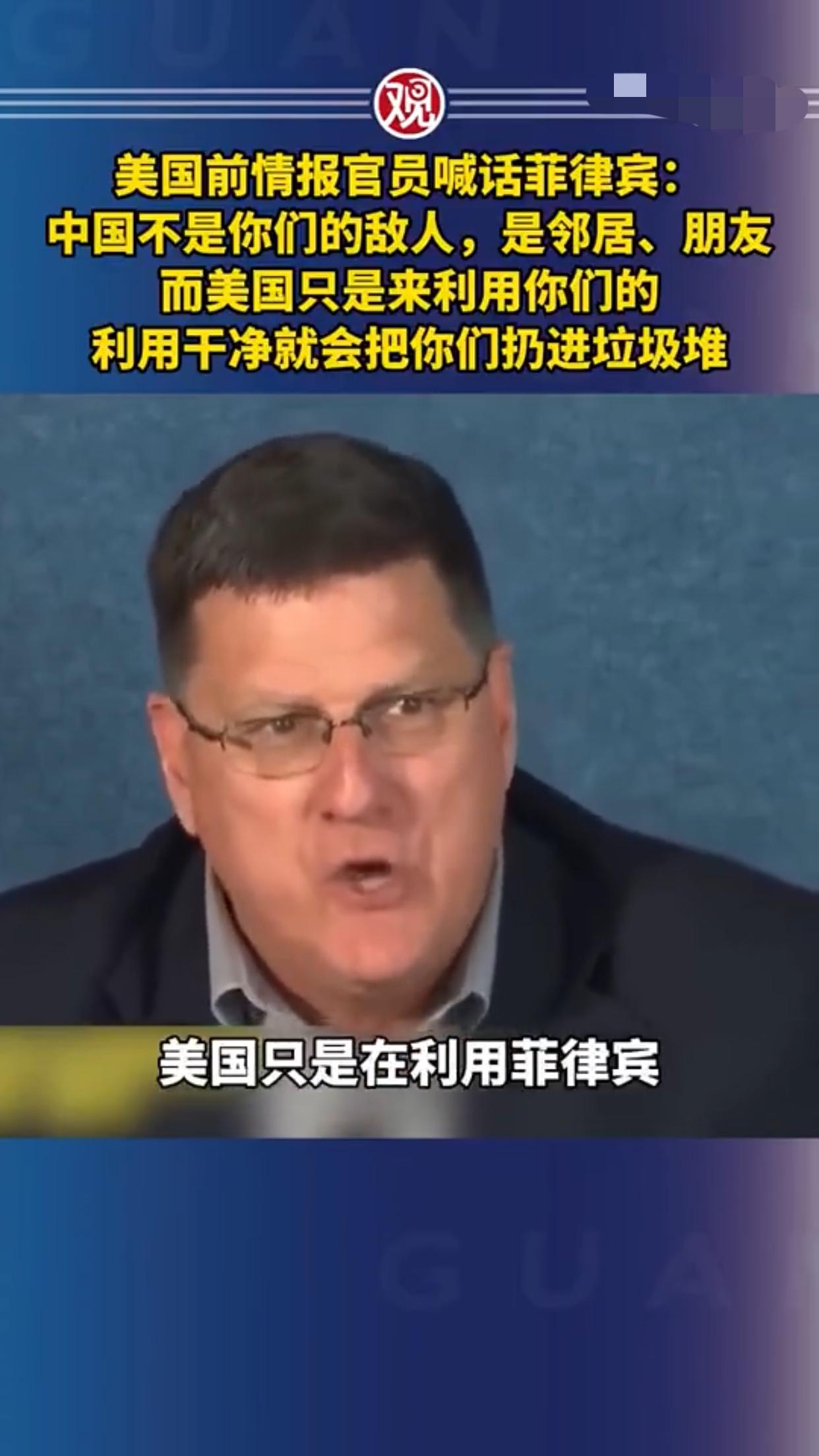 美国前情报官员向菲律宾喊话称:“ 中国不是你们的敌人,中国是你们的邻居,中国是你们的朋友,中国不想要战争,美国不是菲律宾的朋友,美国不喜欢菲律宾,美国只是在利用菲律宾,把菲律宾当工具,美国不是来帮你们的,美国只是来利用你们的,等到你们不再有利用价值,我们就会把你们扔进历史的垃圾堆。”