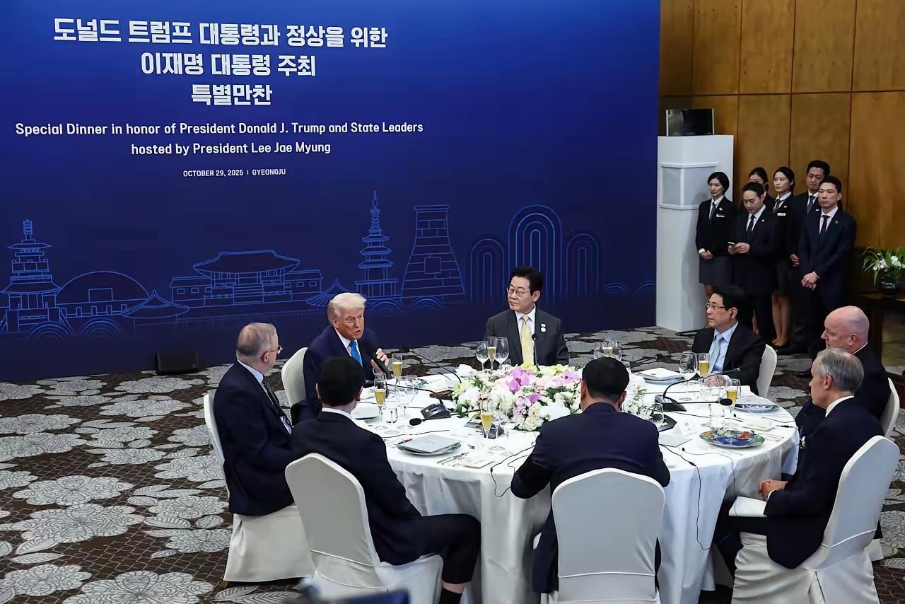【李在明宴请特朗普】 晚宴的这8个国家元首,除了美韩之外,其他的6个国家分别是新加坡,越南,泰国,澳大利亚,新西兰和加拿大。 特朗普这次不出席APEC峰会,李在明特意晚宴送行,双方就投资没有达成共识。 3500亿投资美国,韩国显然做不到,毕竟外汇储备只有4000亿,怎么可能投资那么多? 李在明提出8年分期,每年投资250亿,特朗普十分不悦,坚持一次性投资。