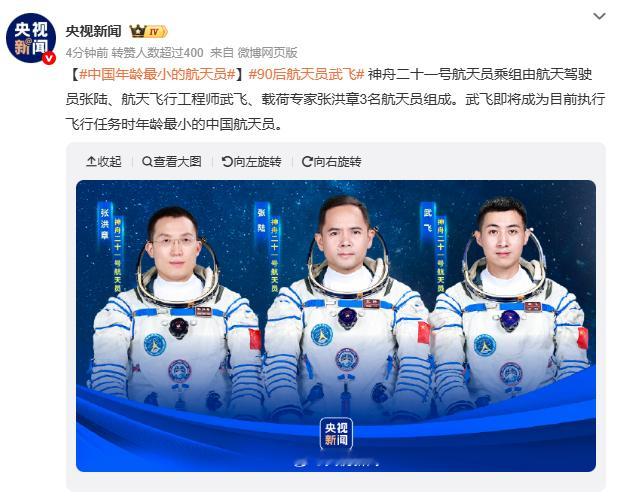 中国年龄最小的航天员看到武飞成为中国年龄最小的航天员,不禁感慨中国航天的蓬勃发展。一代又一代的航天员接力前行,他们是勇敢的追梦人,让我们的太空探索之路越走越远。为中国航天点赞,为武飞加油。