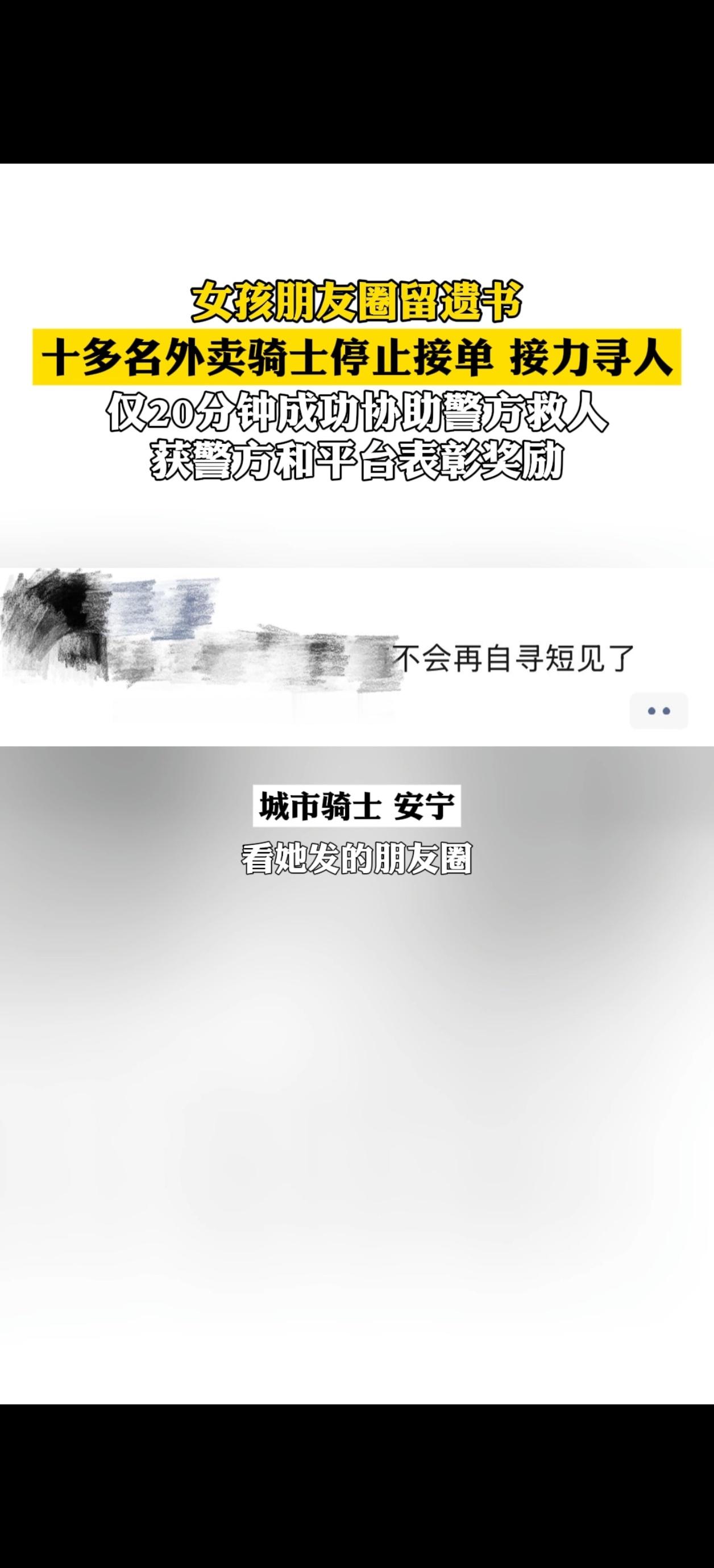 十余名外卖小哥接力帮寻轻生女孩这件事展现了一座城市最动人的模样。女孩的一条朋友圈,瞬间激活了十余名外卖小哥的救援网络。他们放下手头订单,凭借零散记忆拼凑线索,二十分钟完成了一场生命救援。