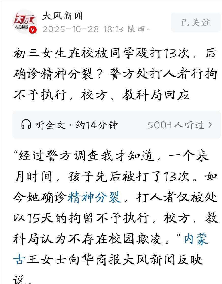 太恶劣了!内蒙古,女子发现上初中的女儿精神恍惚,寝食难安,而且不停的问家里要钱,她觉得很不对劲,一打听才得知,女儿竟然多次在学校被同班女同学殴打。女子惊了,跑到学校要求查看监控,这才发现,短短一个月,女儿被殴打了13次,扇耳光、掐脖子、拽头发撞墙,但她一次都没有还手。女子的心在滴血,马上报警。但因为涉事学生未满16岁,没有被拘留,女子不甘心,找学校讨要说法,谁知,学校的态度更让人气愤。 有件关于两个初中女生的事,最后闹到受害者被诊断出 “未分化型精神分裂症”,这事儿不只是简单的校园冲突。 学校一开始说受害者小郝和施暴者高某 “关系很好”,俩人经常一起吃饭、上下学,可实际根本不是这么回事,高某一直逼着小郝 “只能跟自己玩”,还撕小郝的书本和作业,不让小郝跟其他同学正常来往。 还没出悲剧的时候,小郝其实已经透露出好多求救迹象,以前她是个乖又省心的娃,后来突然变得精神恍惚,没胃口吃饭也不肯上学,但她不敢把被人欺负的事儿说出口,所有恐惧都闷在心里。 可就算这样,最先发现她不对劲的妈妈,还有接到情况反映的班主任,都没找到问题的根源,同学那边也没起到监督作用。 好几个同学都亲眼瞧见高某欺负小郝,甚至还有人专门跟校领导反映了情况,可这些尝试没换来任何有效处理。 最后还是小郝的小姨,发现小郝有一笔600块的异常借款,觉得不对劲,专门去学校打听,才偶然知道了真相,小郝已经被欺负很久了,这场噩梦才算曝光。 学校本来该是保护学生安全的地方,可在这件事里却成了不管事的 “看客”,按相关法律规定,学校得建立防欺凌的机制,发现欺凌要及时制止,还要通知家长,但这所学校的防护措施,根本没发挥作用。 第一就是制度没起作用,有同学好几次反映高某欺负人,可学校领导没采取任何有效办法,防欺凌的制度根本就是个样子。 第二是工作人员没责任心,监控里能看到,5月21号那天,副校长林某路过小郝被打的现场,居然假装没看见,直接走过去了,这事儿就能看出学校管理层根本没把学生的安全当回事。 更过分的是事后处理,小郝家人要求查清楚真相,学校先说 “涉及学生隐私”,不肯给完整监控,直到警察介入才配合,更严重的是,学校没通知小郝家长,自己就判定 “这不算是校园欺凌”。 实际上,高某已经有13次打骂小郝的记录,又是拳打脚踢,又是拽头发撞墙,学校却轻描淡写说成 “肢体冲突”,这不仅是不懂法,更是对受了身心伤害的小郝,造成了二次伤害。 等这事超出校园,走到法律程序这一步,大家本来盼着能有公正结果,警察查清楚了,一个多月里高某一共打了小郝13次,于是给了高某顶格处罚,行政拘留15天,罚款1000块。 这能看出警方的态度很明确,就是要管这件事,可这份看似严厉的处罚,因为高某只有15岁,打了折扣,按法律规定,满14岁但不到16岁的未成年人,就算判了行政拘留,也不用实际执行。 小郝家人本来拒绝了对方5万块的和解请求,就想讨个公道,看到这个结果觉得特别无力,在他们眼里,法律的处罚看着厉害,实际没效果,施暴者根本没付出该有的代价。 最后各方的结局差别特别大:高某虽说被罚款了,可不用拘留,学校里没尽到责的校长、副校长和班主任,也只是被诫勉谈话或者警告。 可受害者小郝永远失去了参加中考的机会,还被诊断出精神分裂症,治好的希望很渺茫,她的家庭也背上了沉重的精神压力和经济负担。