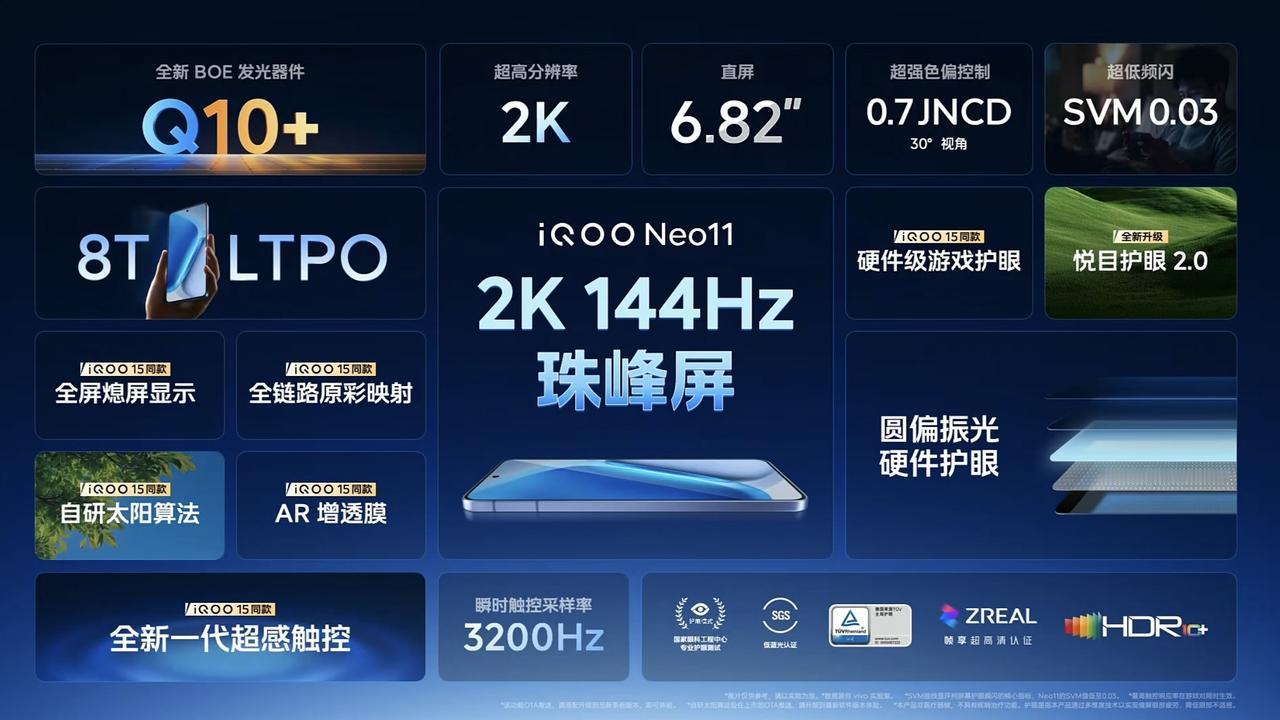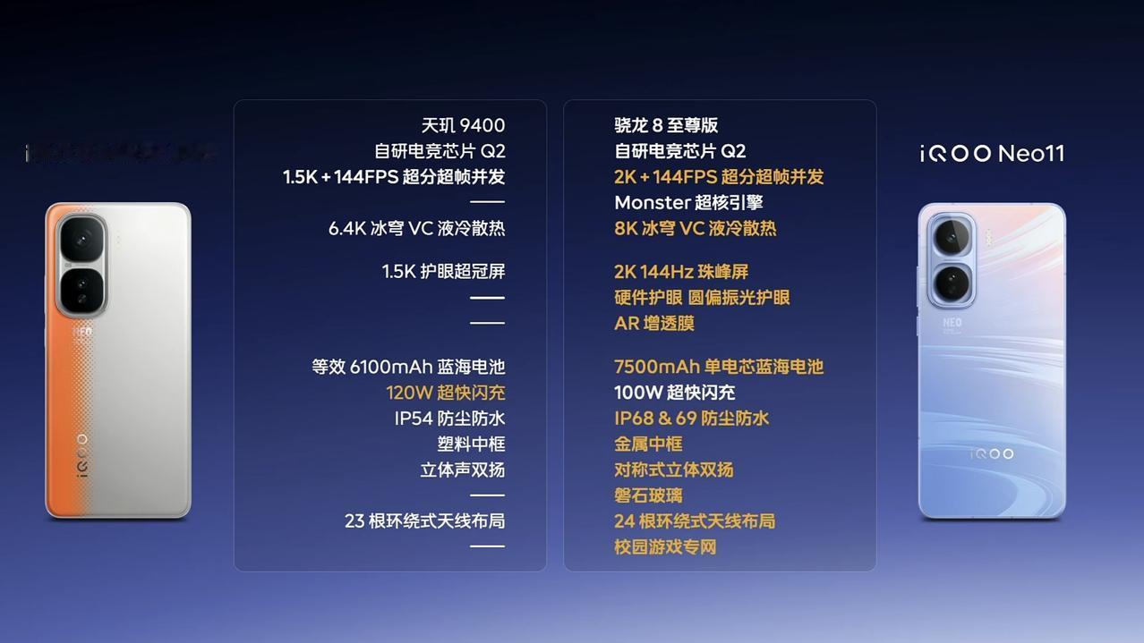 iQOO Neo11正式发布,号称性能游戏体验远超竞品,首销起售价2599元,程潇出任iQOO电竞体验官。 iQOO Neo11使用骁龙8至尊版和UFS 4.1闪存,有电竞独显芯片Q2,安兔兔跑分354万,有6.82英寸2K LTPO珠峰屏,内置7500mAh大电池搭配100W快充,8K VC散热,重量210克,金属中框也安排上了。 其他方面,Neo11有四款颜色,全新颜色“面对疾风”不同角度有不同颜色,使用1/1.56英寸索尼主摄,运行OriginOS 6,号称能做到5年流畅。 iQOO 15同款Monster超核游戏引擎,已支持超过40款原生144Hz游戏,特色功能包括一键投屏开播、免费两年使用校园游戏专网等。 12GB+256GB:2599元 16GB+256GB:2899元 12GB+512GB:2999元 16GB+512GB:3299元 16GB+1TB:3799元