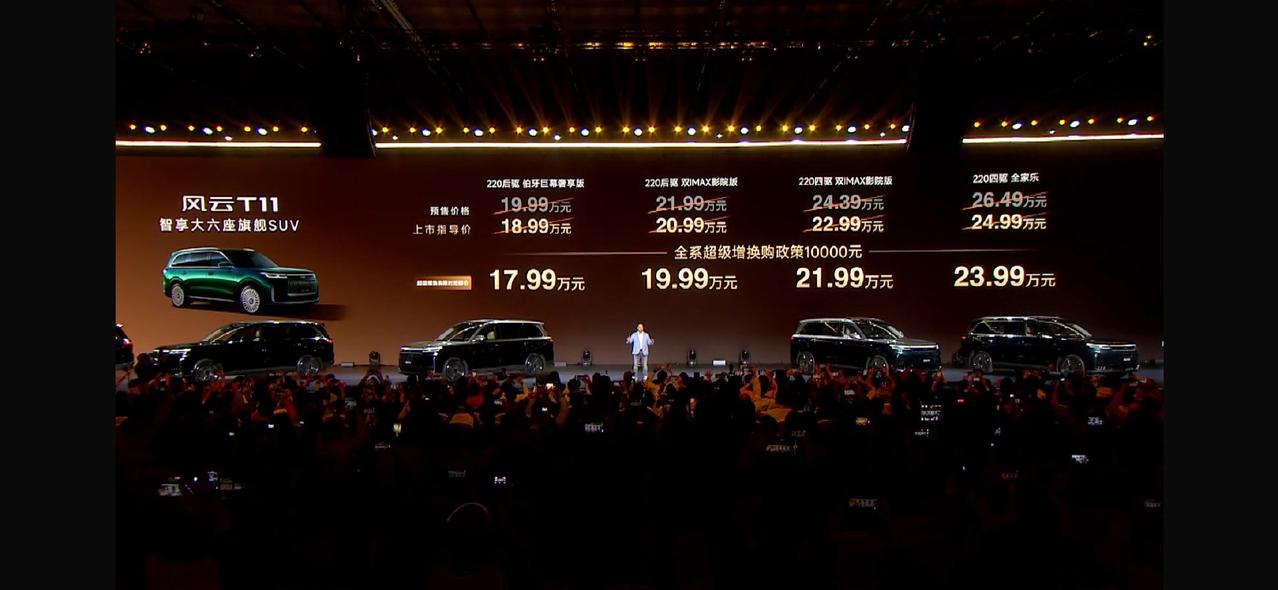 风云T11:17.99万起步。 - 5.2米大六座SUV - 车长5205mm 轴距3120mm - 磁悬浮底盘 - 前双叉臂后五连杆 - 磐石车身2.0,5纵10横车身结构、一体压铸铝合金后纵梁,88%高强度钢铝,2GPa热成型钢,37,300N·m/deg扭转刚度,11个安全气囊。 - 电池IP68防水防尘,泡水48小时不进水,超2026国标。 - 27个感知单元,1颗激光雷达。2颗800万像素摄像头,猎鹰智驾太好用了,城市NOA,支持自动泊车/遥控泊车。 - 零百加速5.4s - 1400公里综合续航,超220公里纯电续航 密码手套箱 - 9.2L冷暖冰箱 - 三温区空调 - 30寸大屏 - 二排娱乐屏 - 母婴级健康座舱 - 伯牙之音23扬声器 - AQS净化系统 - 自10月预售以来18天锁单28732台【来自懂车帝车友圈】