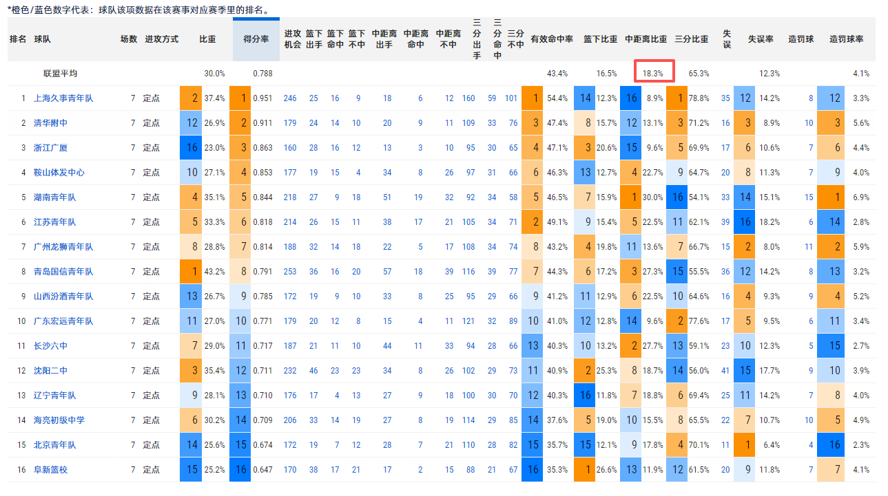 3分球投的最好的球队上海,3分命中率36%才刚刚合格,其余的都在35%以下。中距离就不用说了,5成命中率的一个都没有,就这命中率,定点中距离还能有18.3%的占比。都不算一算这么投划不划得来的么?还不如多投几个三分呢。全国青少年u系列篮球联赛