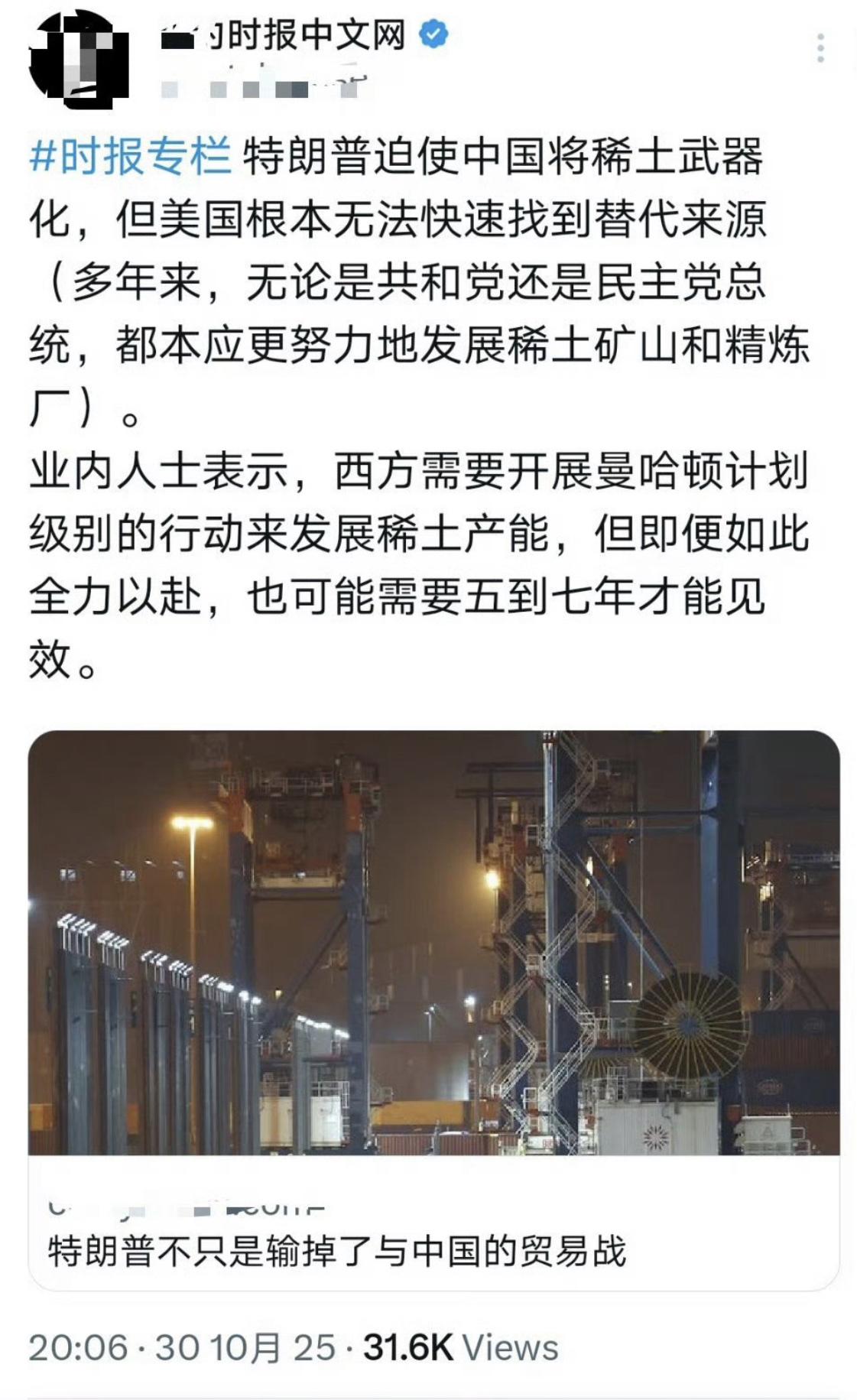 美媒:没有中国的稀土供应,美国的高科技产品和军事武器将无法自由生产,因为美国根本无法快速找到替代来源。 美国与西方伙伴即便全力以赴开展曼哈顿计划级别的行动来发展稀土产能,可能至少需要五到七年才能见到成效。