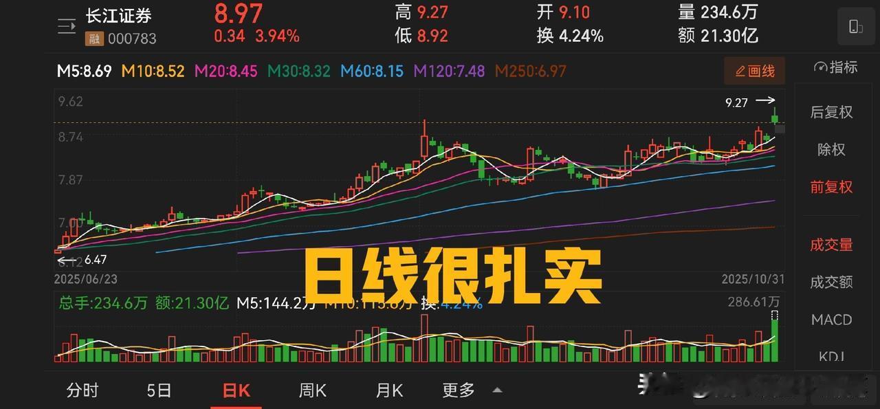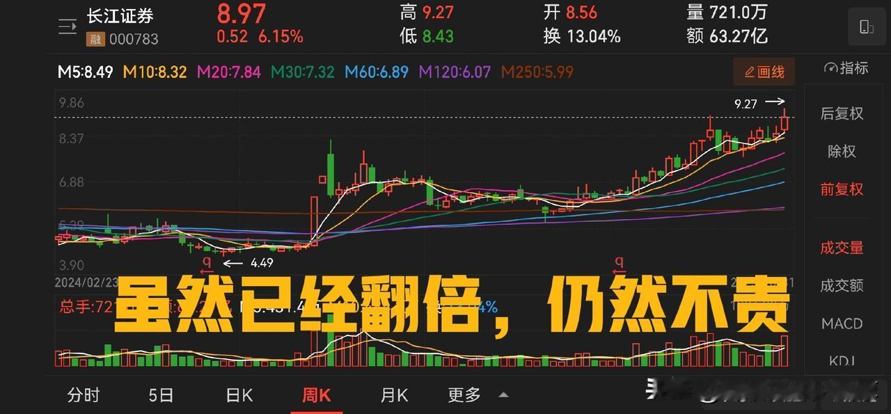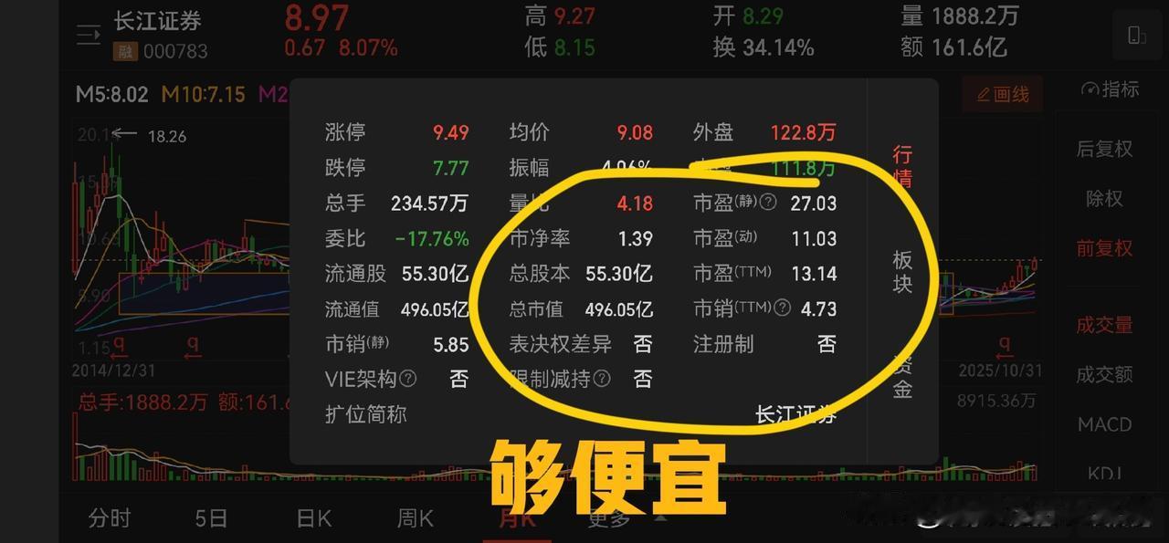 长江证券业绩爆表,目前市净率 1.4 倍,动态市盈率十倍左右,市值约 500 亿,数据很好,具备较高的投资价值。 第三季度营收为37.82亿元,同比增长94.04%;净利润为16.36亿元,同比增长152.76%。前三季度营收为84.86亿元,同比增长76.66%;净利润为33.73亿元,同比增长135.20%。各项增长率都在 100% 或以上,如四季度复制这个业绩,那么全年净利润有望突破 50 亿元。 这是非常漂亮的业绩报告。 从走势看,长江证券还在底部,没有完全走出来,是非常好的买入持有标的。