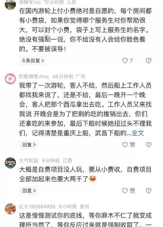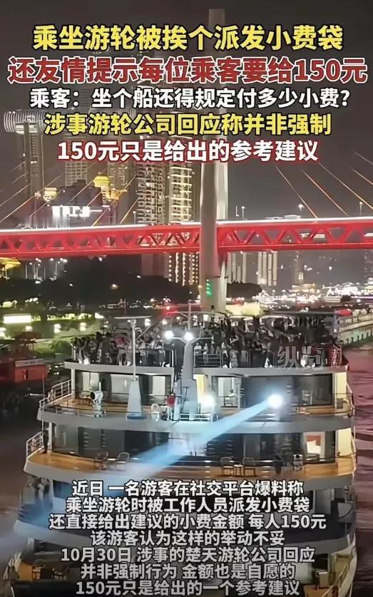 真是活久见!坐个长江游轮,最后一天在餐厅吃饭时,工作人员竟然挨个发红色小费袋,屏幕上还明晃晃写着建议每位游客给150元。这事儿最近在网上炸开了锅! 虽说游轮公司回应称完全自愿,不给不影响服务,但发袋子,标价格这一套组合拳,难免让人感觉被道德绑架。毕竟国内压根没有小费文化,船票从1999到39999元不等,服务费早该含在里面了。 网友观点两极!有人认为觉得服务好自然会给,明码标价就变味了。也有人吐槽这是一步步试探底线,等大家麻木了就成强制了。巴东县文旅局已约谈企业,强调虽无明文禁止小费,但绝不允许强制索取。 说到底,优质服务不该靠暗示性收费维持。与其费心设计小费袋,不如把心思真正用在提升体验上。价格透明,服务到位,游客自然愿意买单。这才是在国内旅游市场的长久之道。