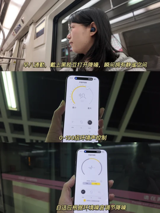 🎧早八通勤,戴上黑胶豆打开降噪,地铁的轰鸣、车厢的嘈杂声,就像被一键静音,瞬间拥有了静谧空间。它能自动根据环境噪音调节降噪,0-100级环境声调节,地铁报站提醒也能清晰听到,不用怕坐过站,降噪可以和苹果耳机媲美。[棒R]