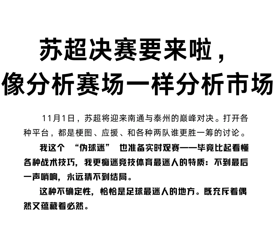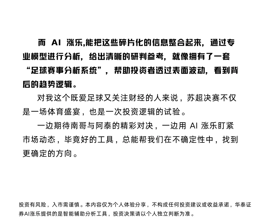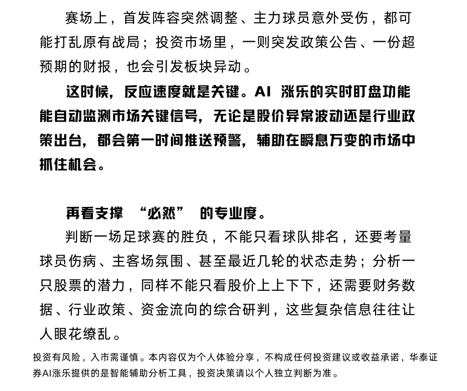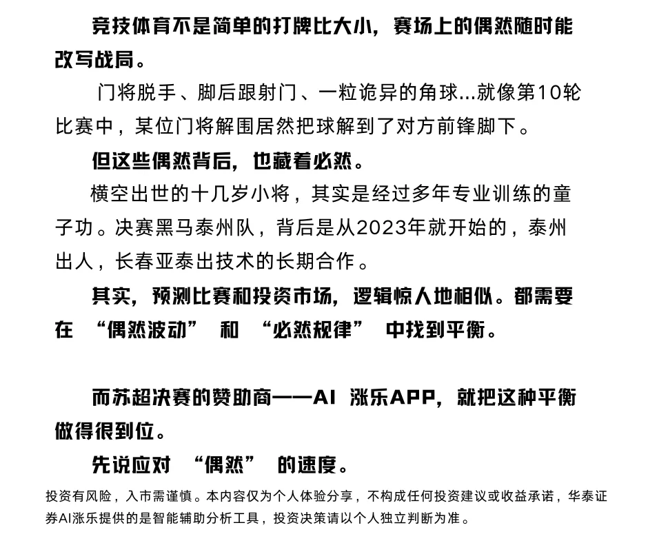 [火R]11月1日,苏超将迎来南通与泰州的巅峰对决。各种平台,都是梗图、球迷应援、和两队谁更胜一筹的讨论。 我这个 “伪球迷” 也准备实时观赛——比起看懂各种战术技巧,我更痴迷竞技体育最迷人的特质:不到最后一声哨响,永远猜不到结局。 [哇R]不确定性,恰恰是足球最迷人的地方。充斥着偶然又蕴藏着必然。 竞技体育不是打牌比大小,赛场上的偶然随时能改写战局。门将脱手、脚后跟射门、诡异的角球,就像第10轮比赛中,某位门将解围居然把球解到了对方前锋脚下。 但偶然背后,也藏着必然。横空出世的十几岁小将,其实是专业训练的童子功。决赛黑马泰州队,背后是从2023年就开始的,泰州出人,长春亚泰出技术的长期合作。 [爆炸R]其实,预测比赛和投资市场,逻辑惊人地相似。都需要在 “偶然波动” 和 “必然规律” 中找到平衡,而苏超决赛的赞助商——AI 涨乐,就把这种平衡做得很到位。 [喝奶茶R]先说应对 “偶然” 的速度。 赛场上,首发阵容突然调整、主力意外受伤,都可能打乱原有战局;投资市场里,突发政策公告、超预期的财报,也会引发异动。这时候,反应速度就是关键。 AI 涨乐的实时盯盘能自动监测市场关键信号,无论是股价异常波动还是行业政策出台,都会第一时间预警,辅助在瞬息万变的市场中抓住机会。 [哇R]再看支撑 “必然” 的专业度。 判断一场足球赛的胜负,不能只看排名,还要考量伤病、主客场氛围、甚至最近的状态走势;分析股票的潜力,同样不能只看股价上上下下,还需要财务数据、行业政策、资金流向的综合研判,让人眼花缭乱。 而 AI 涨乐能把碎片化的信息整合起来,通过专业模型分析,给出清晰的研判参考,就像拥有了一套 “足球赛事分析系统”,帮助透过表面波动,看到背后的趋势逻辑。 [喝奶茶R]对我这个既爱足球又关注财经的人来说,苏超决赛不仅是一场体育盛宴,也是一次投资逻辑的试验。 一边期待南哥与阿泰的精彩对决,一边用 AI 涨乐盯紧市场动态,好的工具,总能帮我们在不确定性中,找到更确定的方向。 财经知识 AI涨乐苏超决赛预测 苏超总决赛 让每一分钱都有方向 AI涨乐 AI燃动向荣耀出发 AI涨乐再出发 AI投资 智能理财 AI陪伴式投资 AI交易助手 风险提示:投资有风险,入市需谨慎。本内容仅为个人体验分享,不构成任何投资建议或收益承诺,华泰证券AI涨乐提供的是智能辅助分析工具,投资决策请以个人独立判断为准。