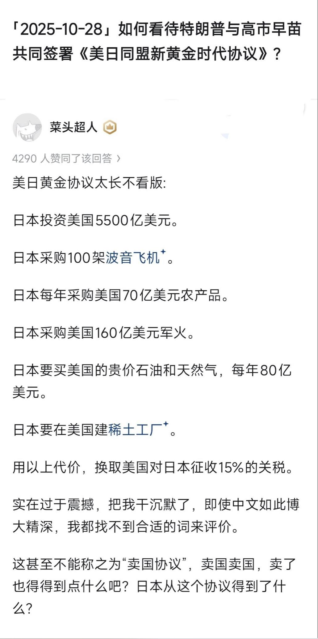 美国特朗普和日本高市早苗共同签署的《美日同盟新黄金时代协议》! 美国要求日本向美国投资5500亿美元,采购100架波音飞机,每年向美国采购70亿美元农产品,每年高价购买80亿美元的美国石油和天然气,日本还需要在美国建立稀土工厂。 通过以上协议可以看出,日本人出钱出力来讨好美国,而美国人什么都不需要做,就能大赚特赚。 日本通过以上超级卖国协议以换取美国对日本征收15%的关税。 高市早苗比李鸿章还要能卖国、卖日本国。