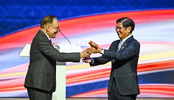 吉隆坡东盟峰会上有个镜头直接冲上热搜,马科斯凑到安瓦尔跟前接过了那把握着“东盟话语权”的木槌。 就这一下菲律宾敲定了明年东盟轮值主席国的身份,距离上回担起这个角色已经隔了整整6年。 对此马科斯当场就感慨表示“这是大责任也是好机会”,可他不知道的是下面的人早就吵翻了天。 先说刚卸任的马来西亚,人家这一年可是交出了满分成绩单,不仅让东帝汶顺利加入东盟,成了第11个成员国,而且还把柬埔寨和泰国缠了30年的边境麻烦彻底解决了。 然而菲律宾也不是头一回挑起东盟的大梁,2006年它牵头拉着东盟搞农业合作,现在超市里常见的菲律宾香蕉、菠萝,不少都是当年合作攒下的缘分。 只不过热闹底下的争议也早就藏不住了,毕竟马科斯总爱把菲律宾自家的南海小算盘,裹上“东盟共同主张”的外衣。 他一边喊着“要推进谈判”,又一边在海上耍小心思,要知道东盟有个硬规矩,凡事都得10个成员国一起点头,想搞“我说了算”门儿都没有。 现在木槌到了菲律宾手里,接下来这一年才是真关键,要是它能接着搞经济合作,这才是真金白银的好处。 可要是一门心思瞎折腾,破坏了区域稳定,别说大家不答应,东盟的兄弟们也不会惯着它,之前马来西亚把“接力棒”跑得稳稳的,菲律宾这把到底能不能接得住呢?