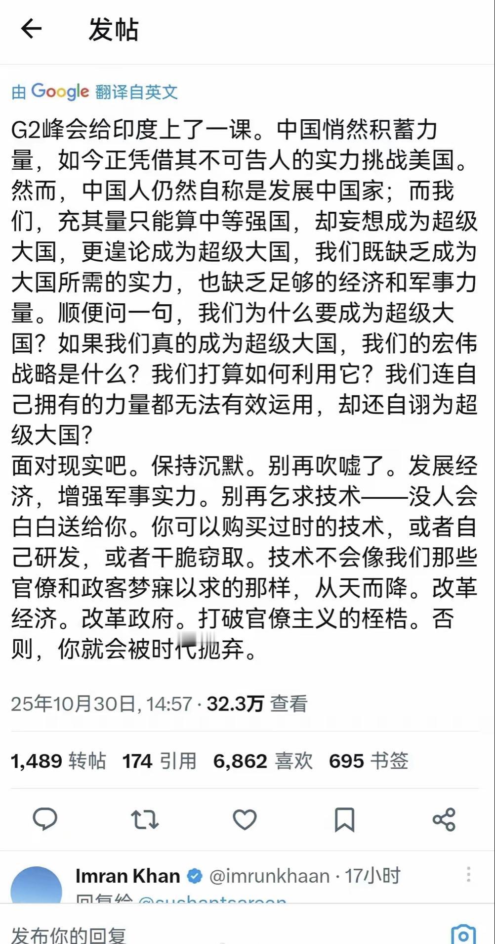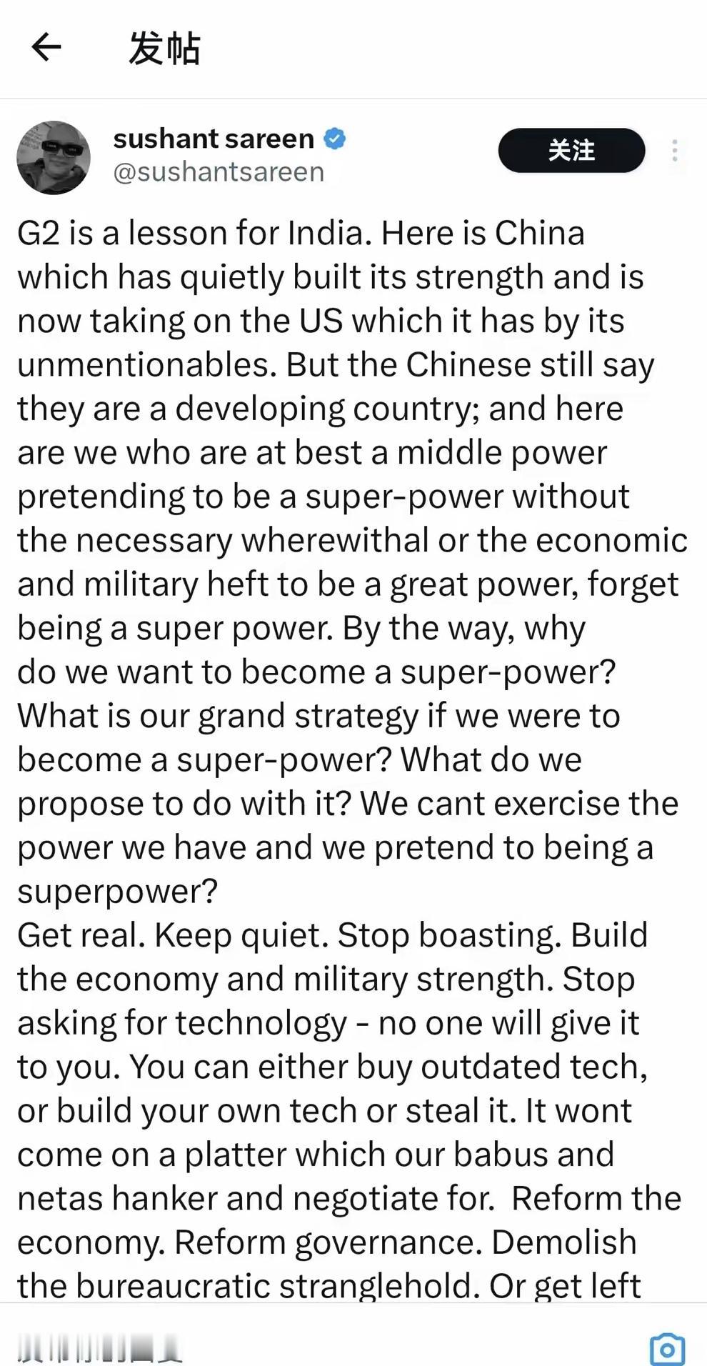 印度网友发文表示:“中美G2峰会给印度上了一课。中国悄然积蓄力量,如今正凭借其实力挑战美国。 然而,中国人仍然自称是发展中国家,而我们印度,充其量只能算中等强国,却妄想成为超级大国,更遑论成为超级大国,我们既缺乏成为大国所需的实力也缺乏足够的经济和军事力量。 面对现实吧,保持沉默,别再吹嘘了,发展经济,增强军事实力,别再乞求技术,没有人会白白送给你,你可以购买过时的技术,或者自己研发,或者干脆窃取,如果印度不改革,就会被时代抛弃。”
