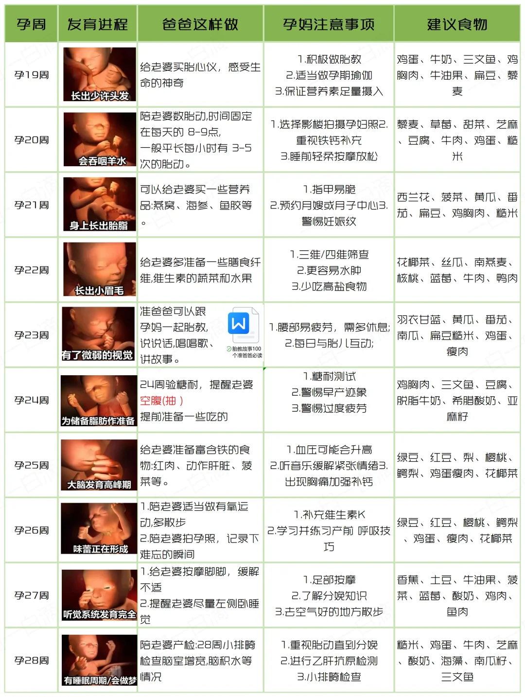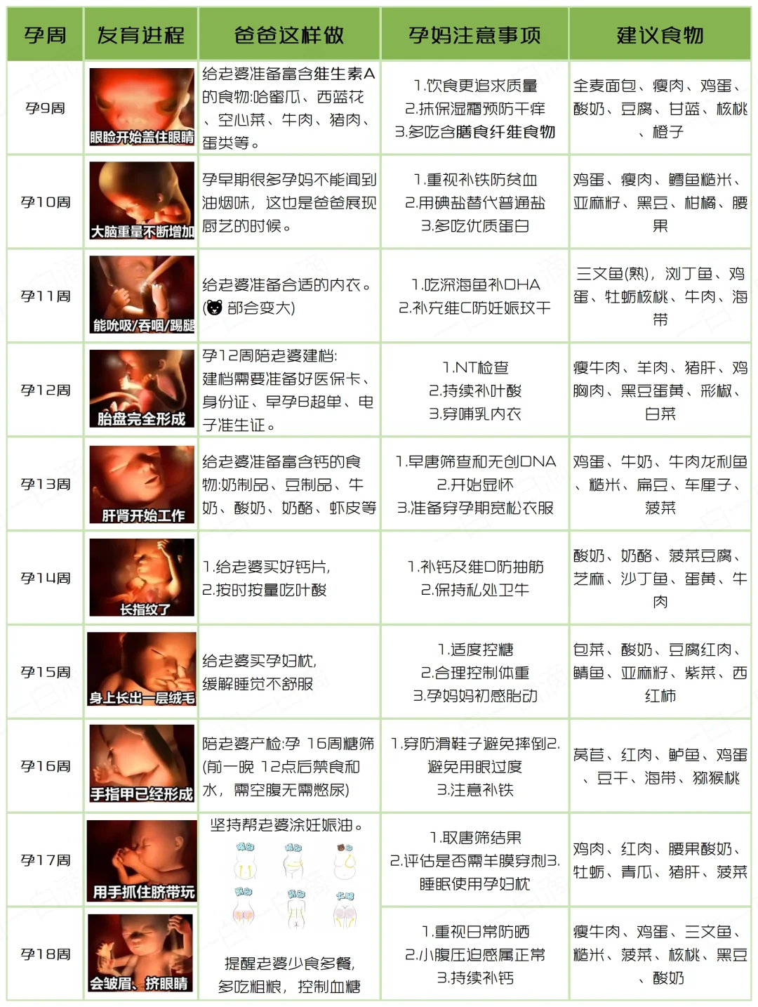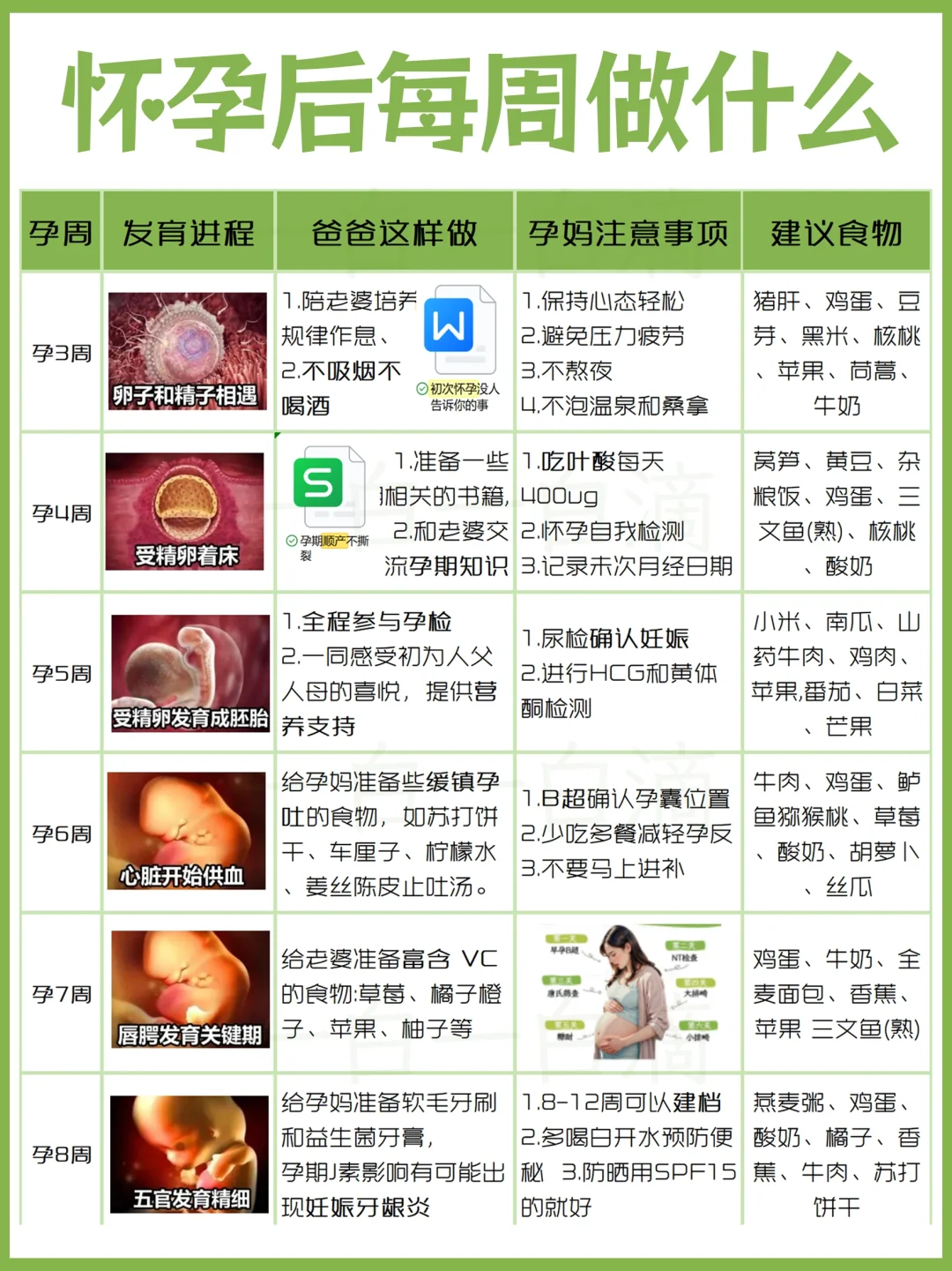 准爸爸每天需要怎么做?每周可以吃什么? 想了解胎儿每周的发育情况? 看完就不会迷茫了~ 新手爸妈码住了 🌟辛苦整理出来的 怀孕3周-产前,整个孕期每周安排! ✅宝宝发育进程 ✅准爸爸这样做 ✅孕妈注意事项 ✅建议食谱 ❤️怀孕的时候是准爸爸准妈妈最幸福的时候, 一起努力,迎接一个健健康康的宝宝吧~
