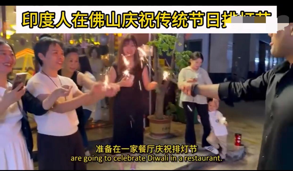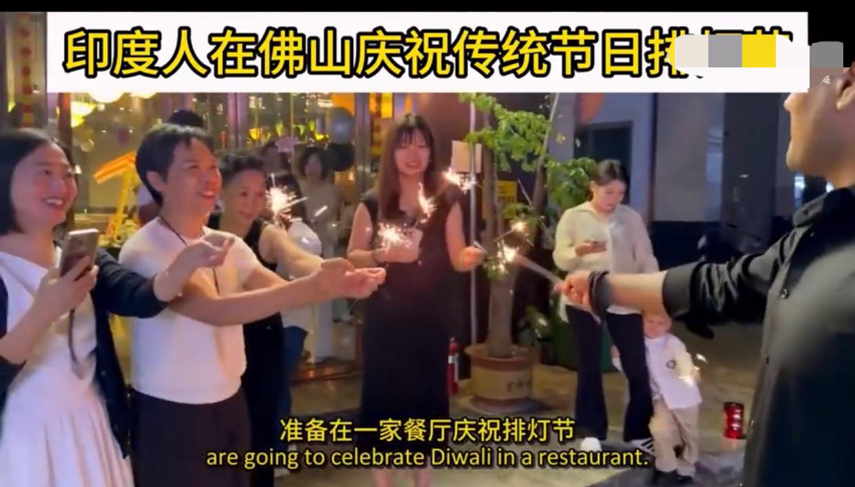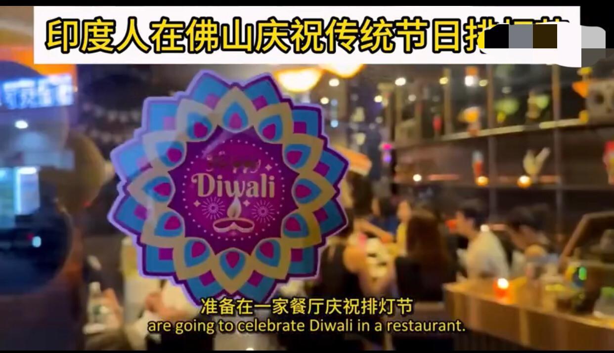 印度人在广东佛山和当地人一起庆祝印度的传统节日排灯节。 印度网友:“朋友们,排灯节快乐!我现在在中国佛山,一些印度人和中国人,准备在一家餐厅庆祝排灯节,这一定会很有趣。”