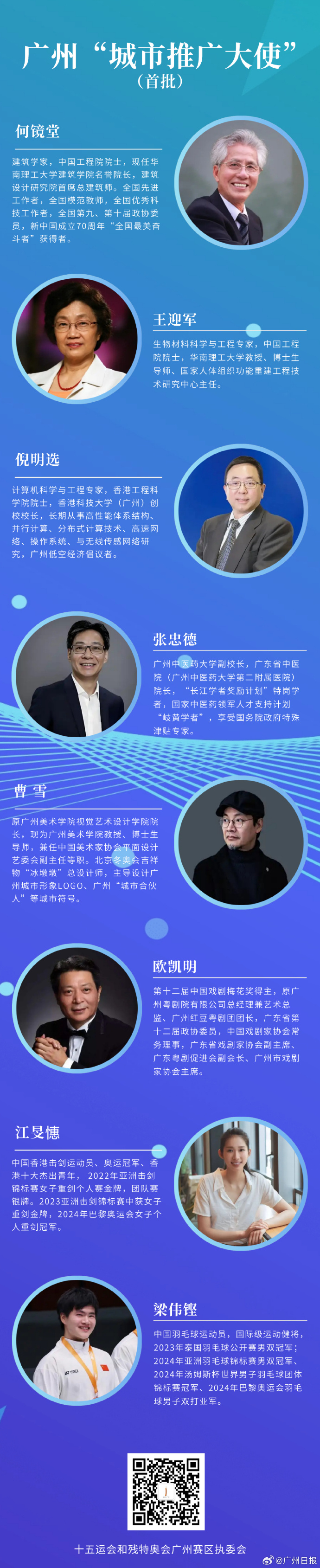 梁伟铿入选首批广州城市推广大使 广州市正式公布首批“城市推广大使”名单,在体育竞技领域,中国香港击剑运动员、奥运冠军江旻憓和知名羽毛球运动员梁伟铿入选。他们不仅代表了拼搏向上的体育精神,更将成为连接广州乃至粤港澳大湾区链接世界的体育文化桥梁。