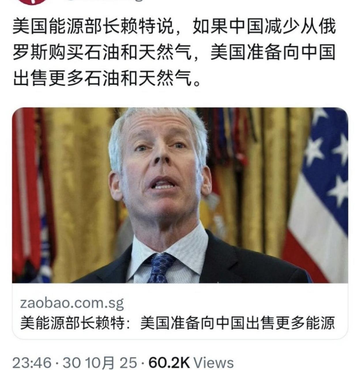 外媒:美国能源部长赖特称,如果中国减少从俄罗斯购买石油和天然气,那么美国准备向中国出售更多石油和天然气。