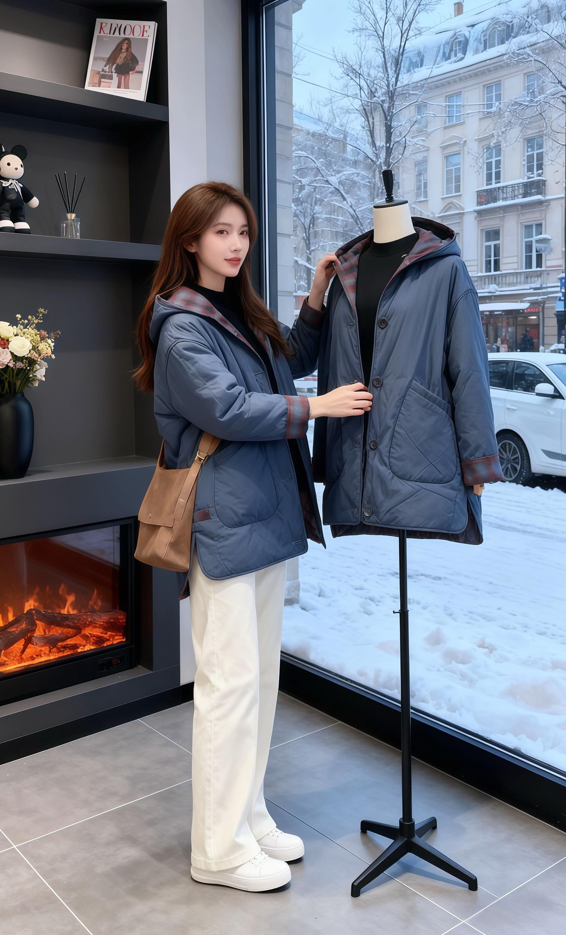 《她的双面穿搭,在秋冬美成了两副模样》 林晚的秋冬衣橱里,藏着一件“魔法棉服”。 一面是雾霾蓝的简约款,配米白阔腿裤与小白鞋,往画架前一站,萨摩耶和调色盘都成了她的时尚配角,文艺感拉满秋冬穿搭灵感 文艺女孩;另一面翻过来,红灰格纹瞬间解锁复古画风,蹲下身撸猫时,连猫咪都忍不住多蹭她两下复古穿搭 猫系女友。 深秋落叶里,她穿它踩过一地金黄;初雪降临日,它又陪她在暖炉旁把日子过成诗。一件衣服,两种风格,就像她的生活,可文艺可复古,在秋冬的每一个瞬间,都美得独一无二