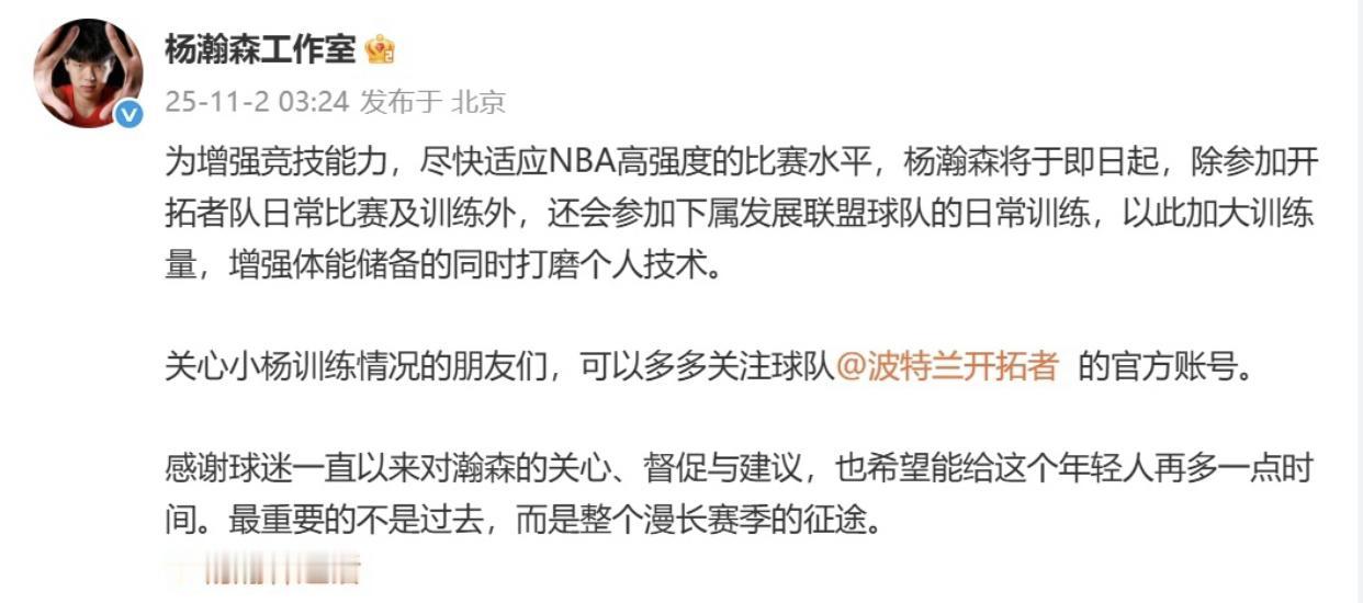 杨瀚森被下放至发展联盟球队撕裂之城混音进行比赛训练。 开拓者官方没有说何时何地将他召回。 有小道消息说,他可能会在与湖人队的比赛中回到开拓者队。 也有消息说,他可能很难再回到开拓者球队比赛了,因为发展联盟的球员大多很独,竞争激烈,他们大都在竞争一个NBA正式合同。 杨瀚森要是真的感觉回开拓者队重新打球无望,在发展联盟球队训练之余,还是继续和女友一起吃饭逛街增进感情吧!