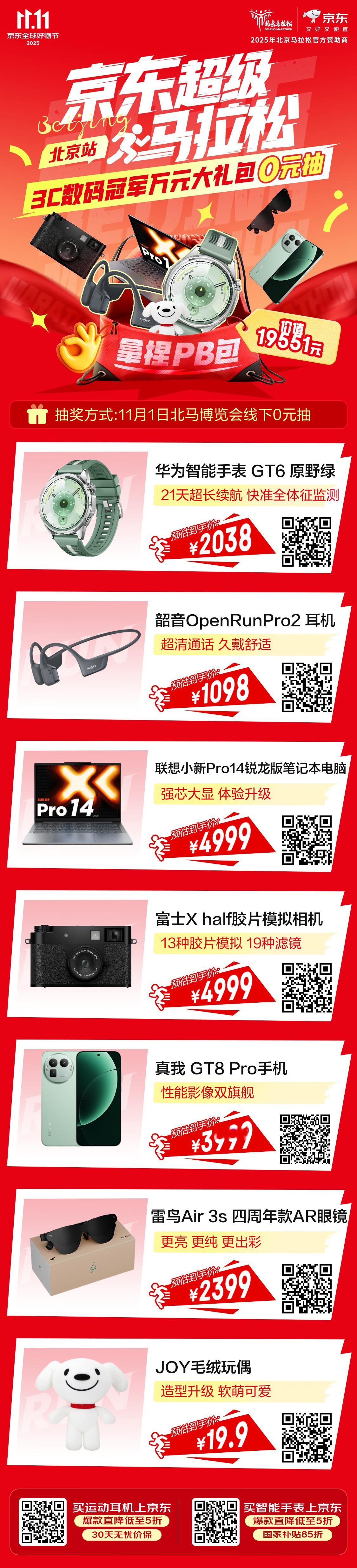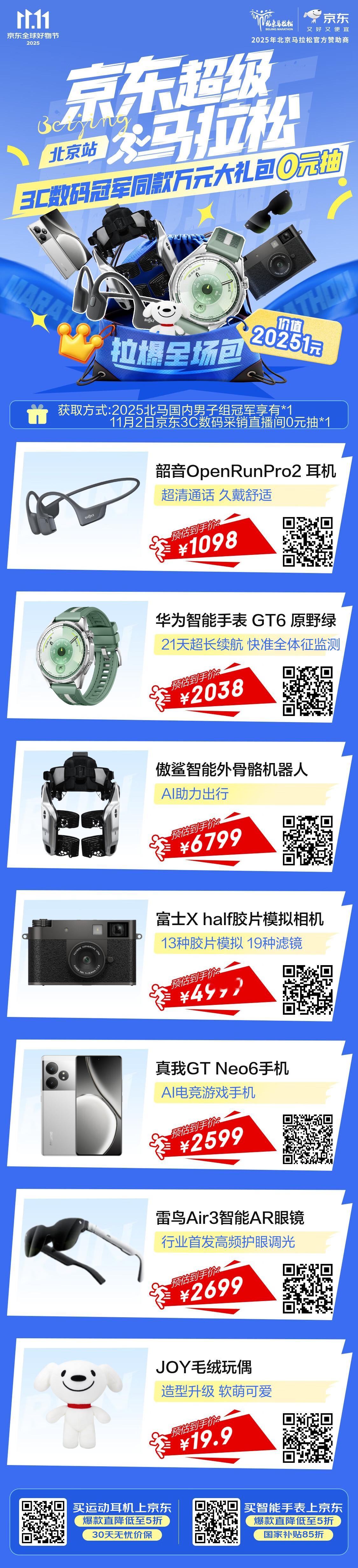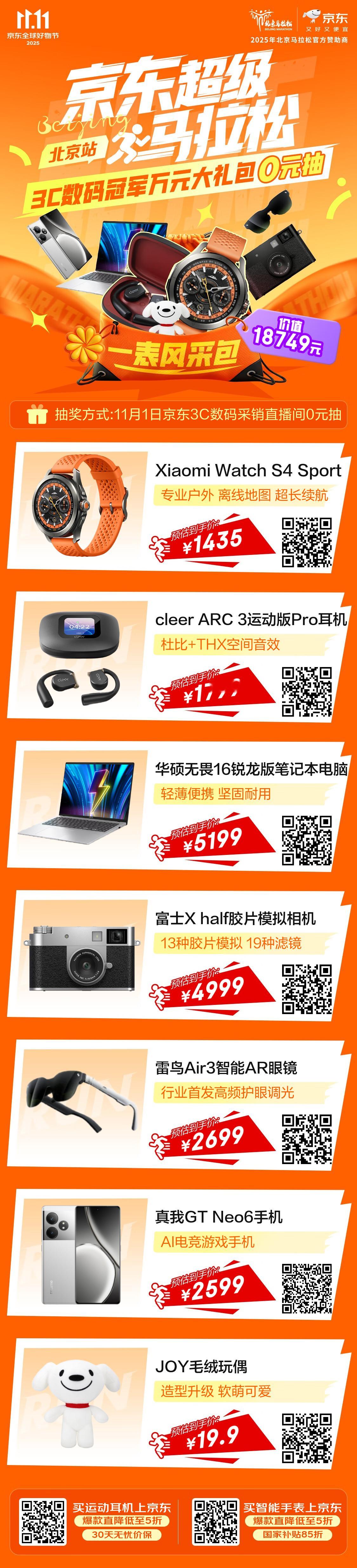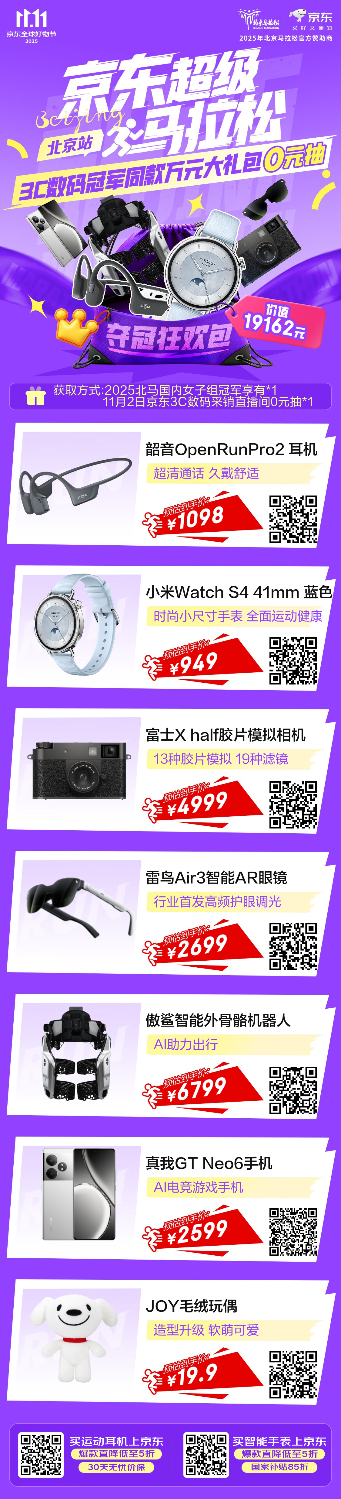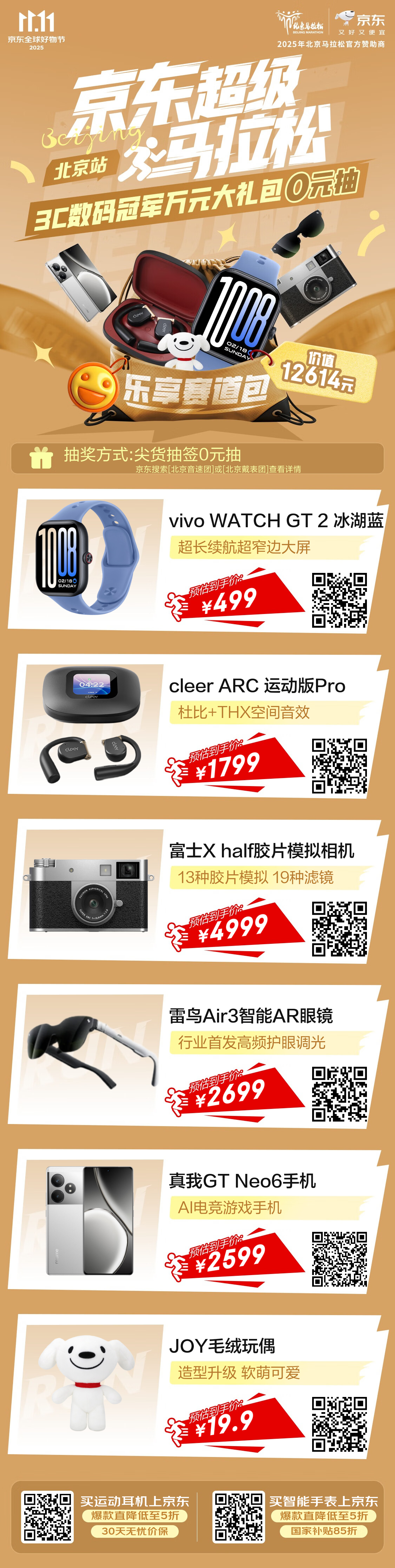 京东11.11又好又便宜 跑马拉松不是单打独斗,好装备就是最靠谱的 战友!11月 2日北京马拉松,京东 3C 数码来送福利,为你配齐 “战友”:智能手表精准测心率、记配速,帮你科学奔跑;运动耳机降噪防汗,让节奏不被打断。