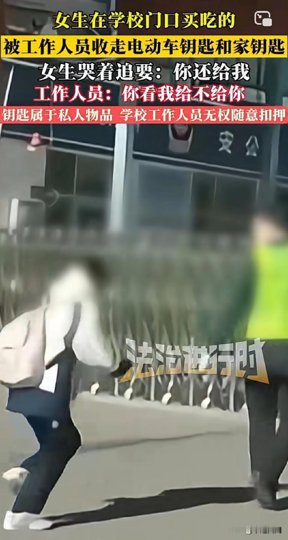 那不是公安门口吗?警务室? 不让买门口的吃的是对的,但拿人学生家里钥匙就不是人干的事! 女生在学校门口买吃的,被工作人员收走电动车钥匙和家门钥匙, 女生哭喊追要:你还给我啊! 工作人员:你看我给不给你。 学校边上是《警务室》,保安休息的地方,不是真的派出所。可以报警,保安没权利没收钥匙!