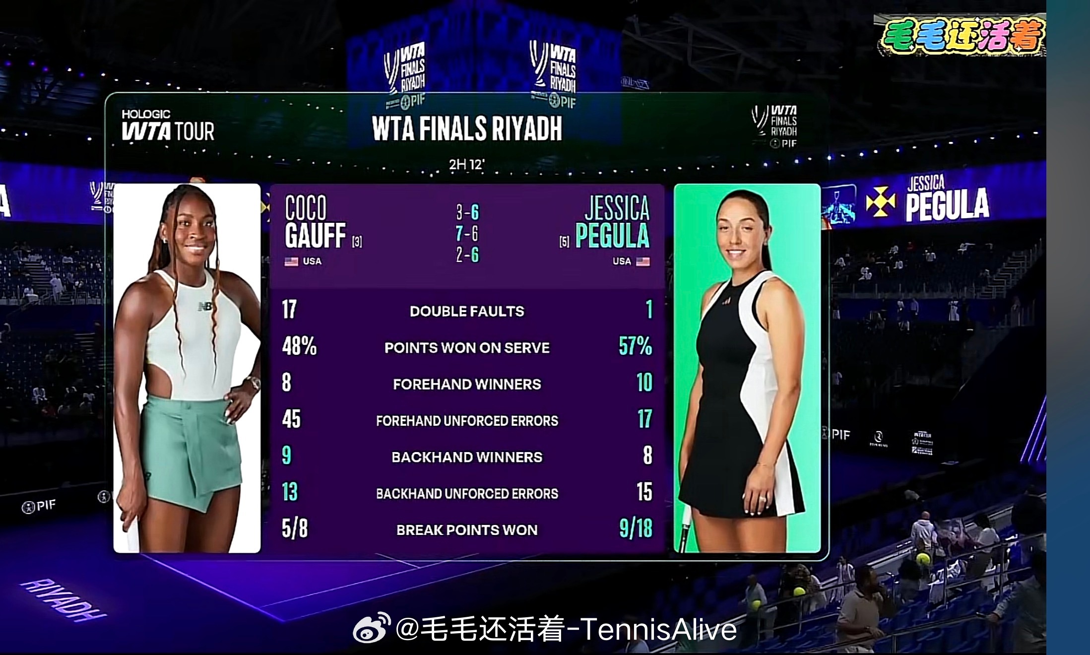 全场比赛75非受迫性失误,其中17双误、45正拍非受迫性失误……今天的高芙发球没有之外,正拍完全失灵。很多球都是打不实,飞天或者打的过于浅。在没有发球的情况下,自己的二发也拿不到什么分数。想要靠底线稳定拿下比赛,完全没有办法。 而佩古拉自然不会给高芙这个机会。