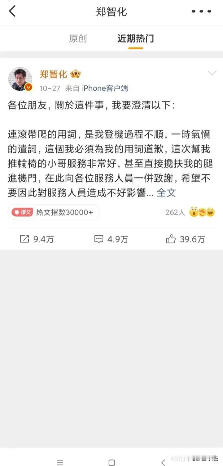 郑智化兑现诺言只兑现了一半。 在曾经的回应中,郑智化言之凿凿承诺将做两件事: 第一,关掉微博; 第二,退出歌坛; 目前他确实清空了微博,连最后一篇澄清文也删掉了,但并未注销账号,暂且可以理解成他说的关掉就是清空内容,那么这点他做到了。 但我不关心他关不关微博,我只关心他会不会退出歌坛,希望他能说到做到,不要让相信他的人失望。