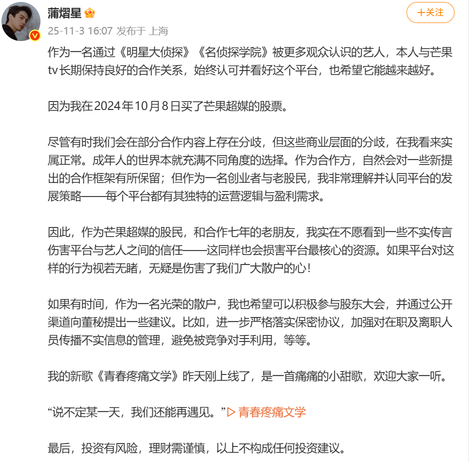 【#蒲熠星回应通告费#】#蒲熠星买了芒果股票#11月3日,有娱乐博主#曝男艺人要