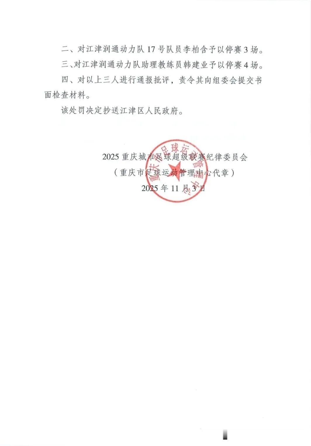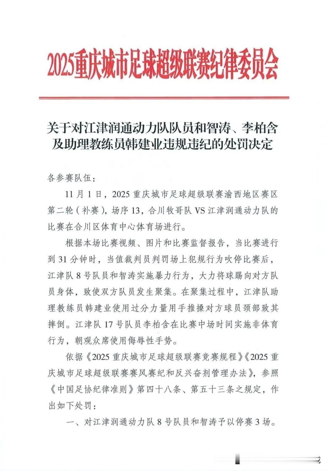 渝超江津队多人遭停赛处罚,其中2名球员遭停赛3场,助理教练员遭停赛4场!这次处罚给所有球队预警,球场外为了话题,可以是比赛第一,友谊第二,但球场之上,一定是比赛第二,友谊第一,不能为了赢不顾一切,一定要尊重规则,尊重对手,你对这次处罚,怎么看?