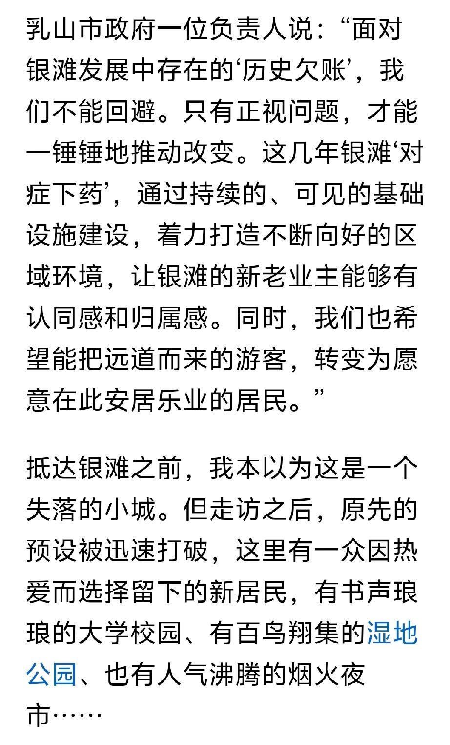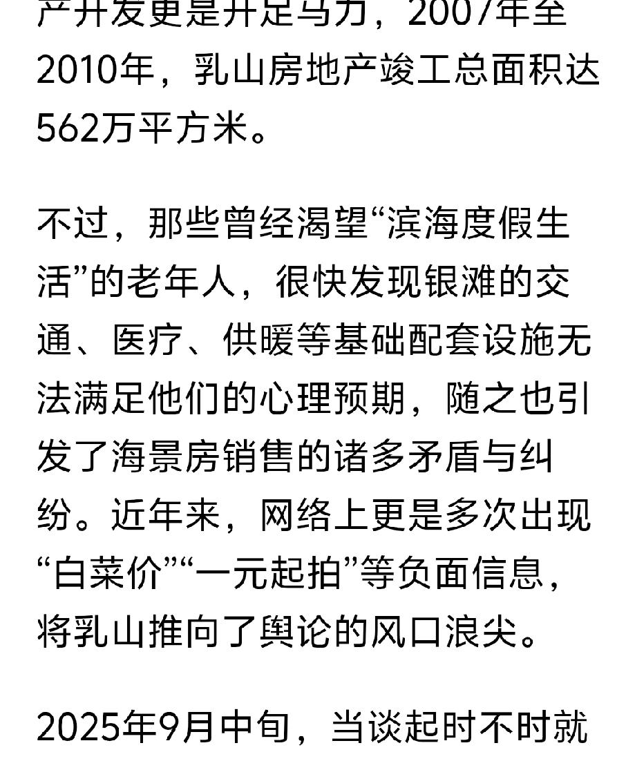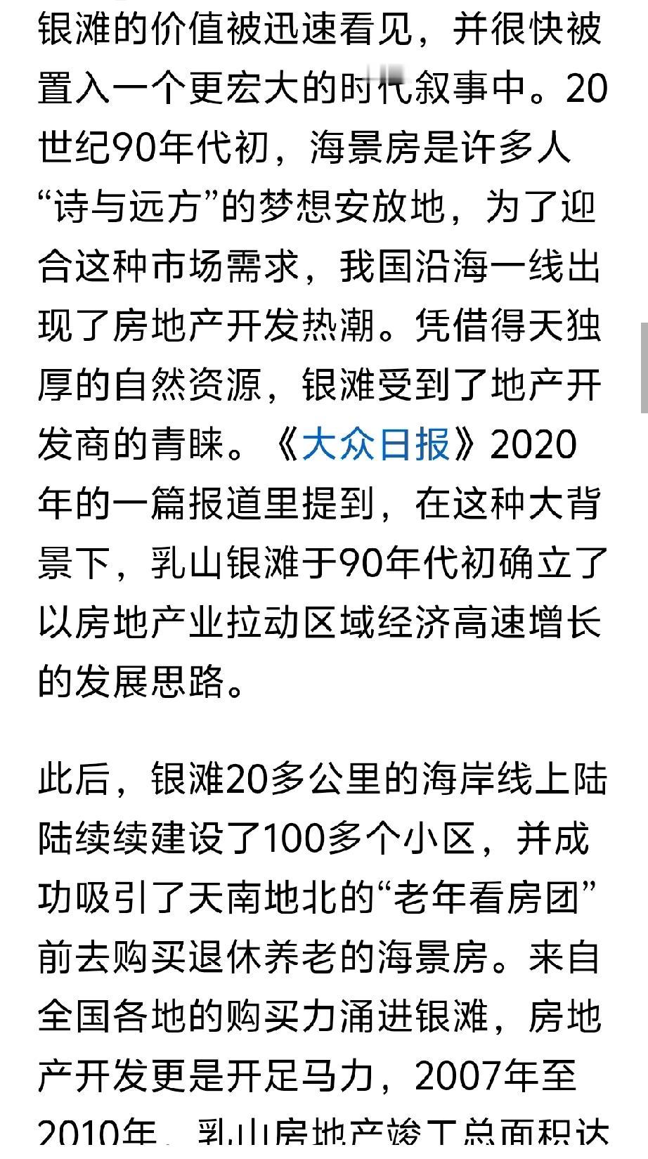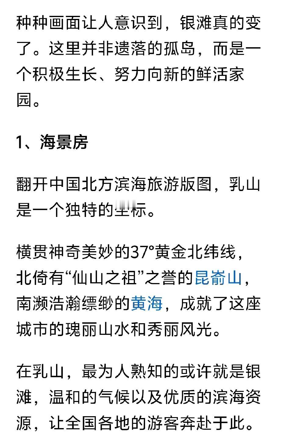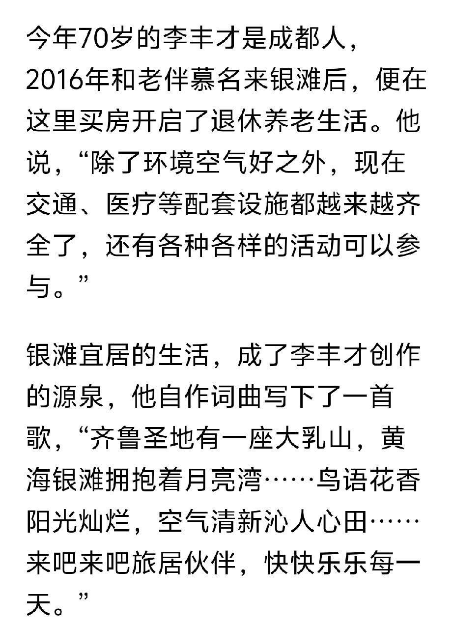 这篇文章是澎湃记者,采访乳山银滩的专题的文章,全方位正确对乳山银滩的报道。 文章从多个方面介绍乳山银滩,从最初的“诗和远方”的海景房到老年看房团,一元法拍房。从海边养殖区私搭乱建到海岸线的生态修复和整治。从银滩海景房最初规划不完善到医疗,交通,公共配套的逐渐完善。从年轻人的“乌托帮”到海上风力发电对人才的需求。从怎么样让银发老年人在银滩过的更舒心等等,多方面全方位的对乳山银滩正确客观的评价。乳山银滩 秋日生活打卡