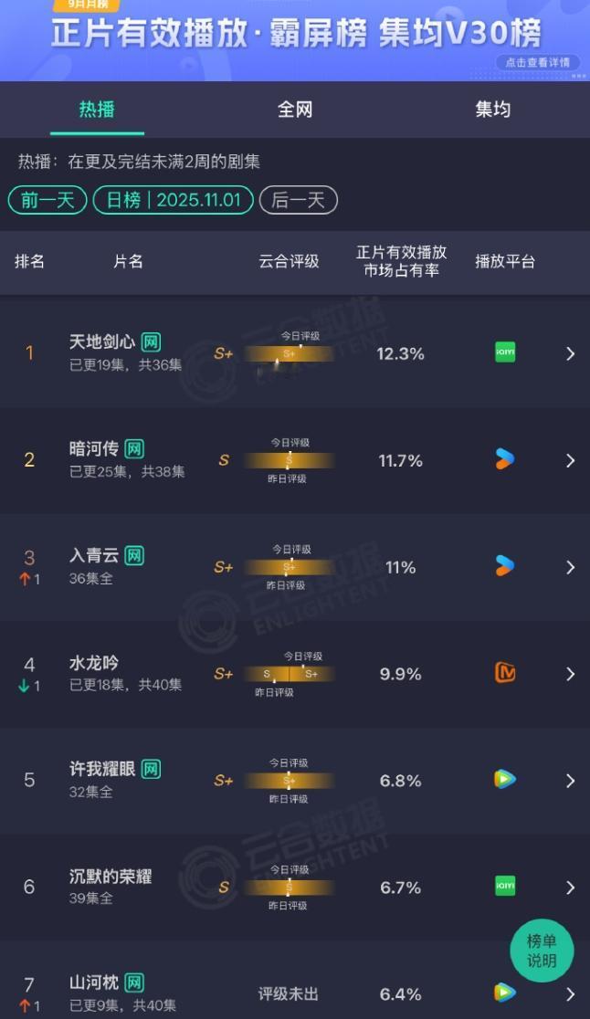 11月1日云合数据 成毅的《天地剑心》2300万播放,龚俊的《暗河传》2200万播放,侯明昊收官的《入青云》2100万播放,罗云熙《水龙吟》1800万播放,宋茜丁禹兮《山河枕》1200万播放。