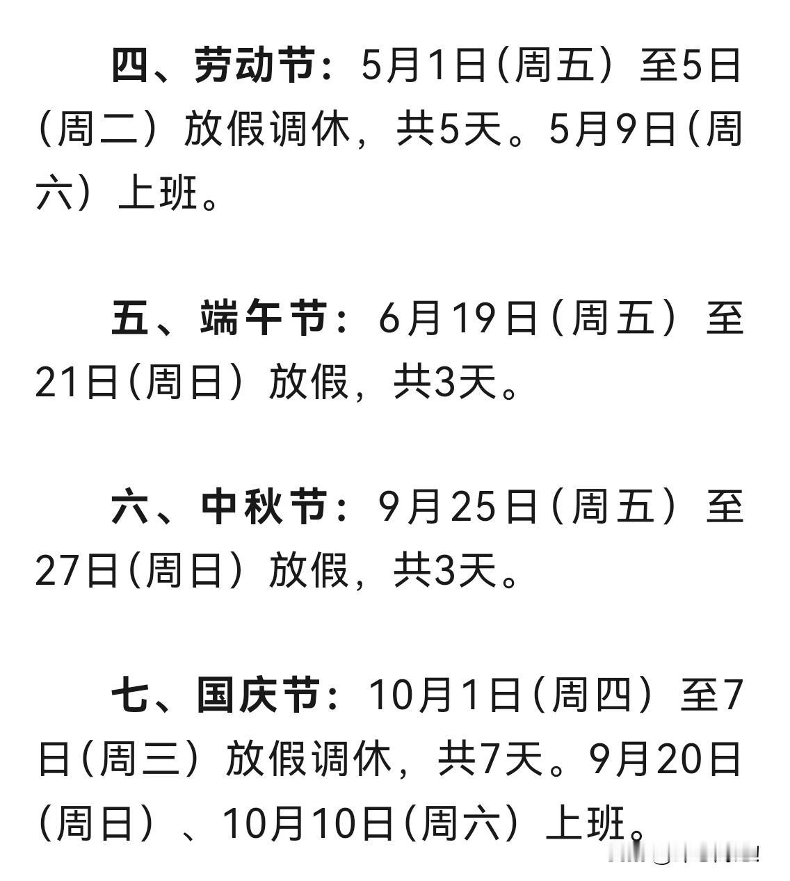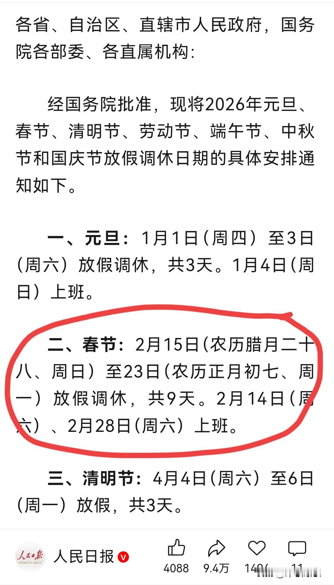 好消息!2026年春节放假9天哦!虽然有调了两天,还是有增加天数了!大家可以更好的安排时间去走亲访友了!