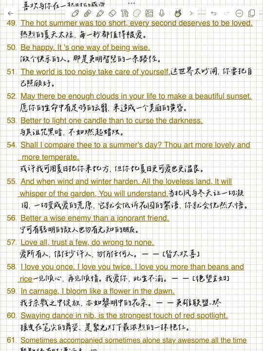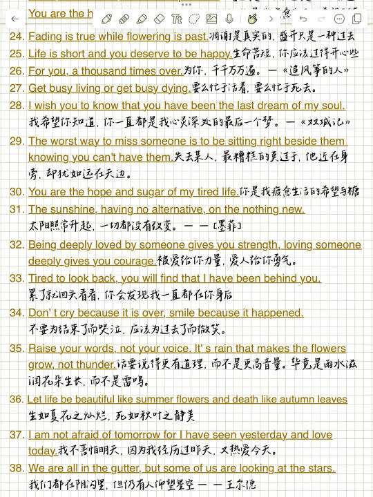 1. Meet you like the wind.遇见你,温澜如风。 2. Live long and prosper.生生不息,繁荣昌盛。 3. And forever has no end.永永远远,永无止境。 4. There is always a better way.总有更好的办法。 5. Better be your own universe.不如做自己的宇宙。 6. The longest day has an end.最难过的日子也有尽头。 7. No pains, no gains.一分耕耘,一分收获/不劳则无获! 8. I met you dead wood for spring.我遇见你,枯木逢春。 9. You are gentle with the sun set glow.你与霞光共温柔。 10. We all meet better ourselves.我们终将遇见更好的自己。 11. Born sensitive, lonely and happy.生而敏感,孤独而快乐。 12. May everything you meet be gentle原你所遇皆是温柔。 13. Whatever you do, do not let go!不管你做什么,都不要放弃! 14. We will go ashore in the sunshine.我们终将上岸阳光万里。 15. My journey is the stars and the sea.我的征途是星辰大海。